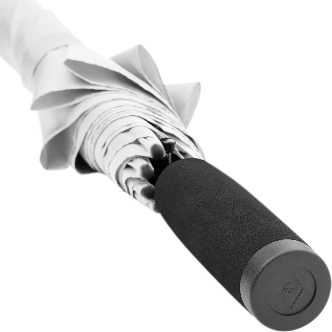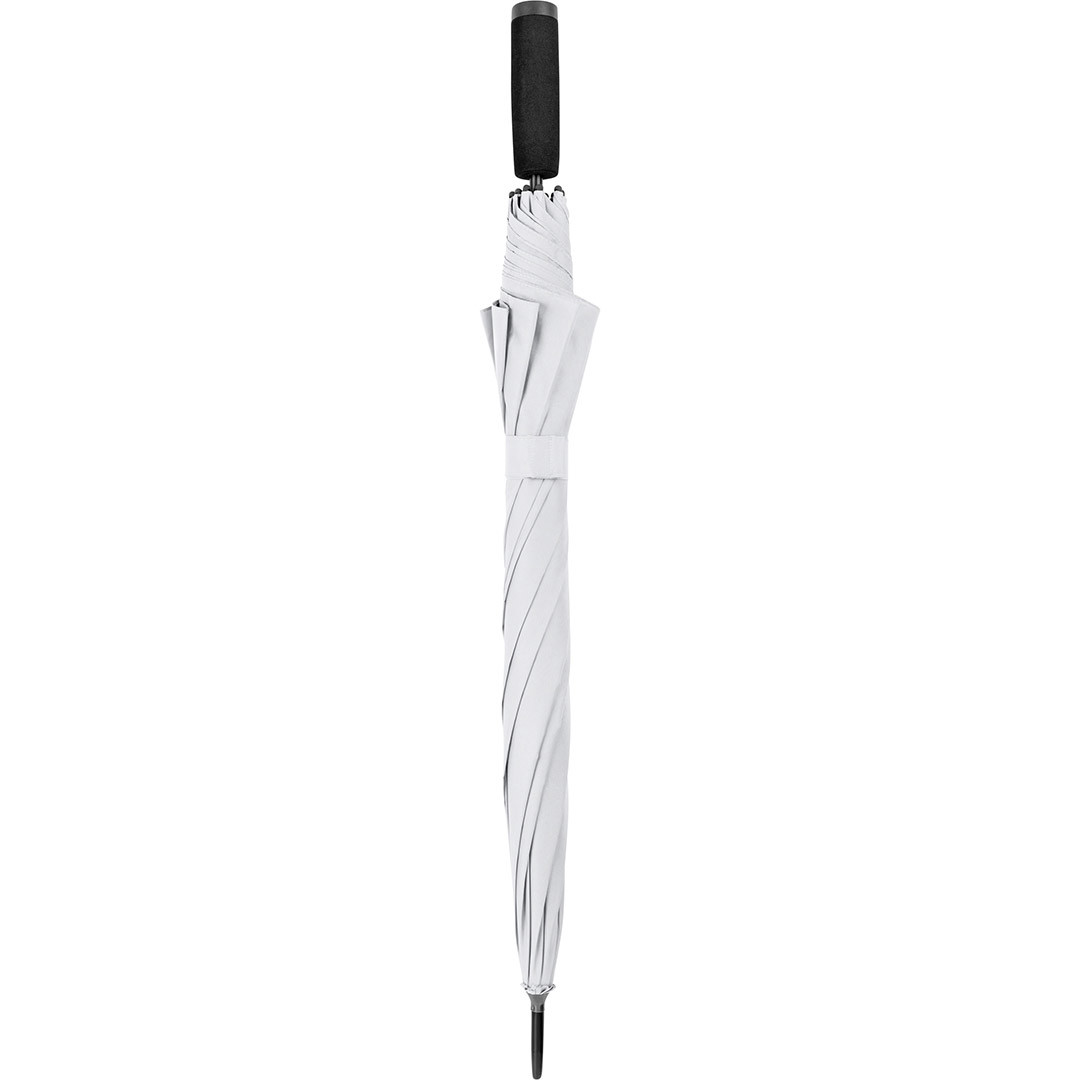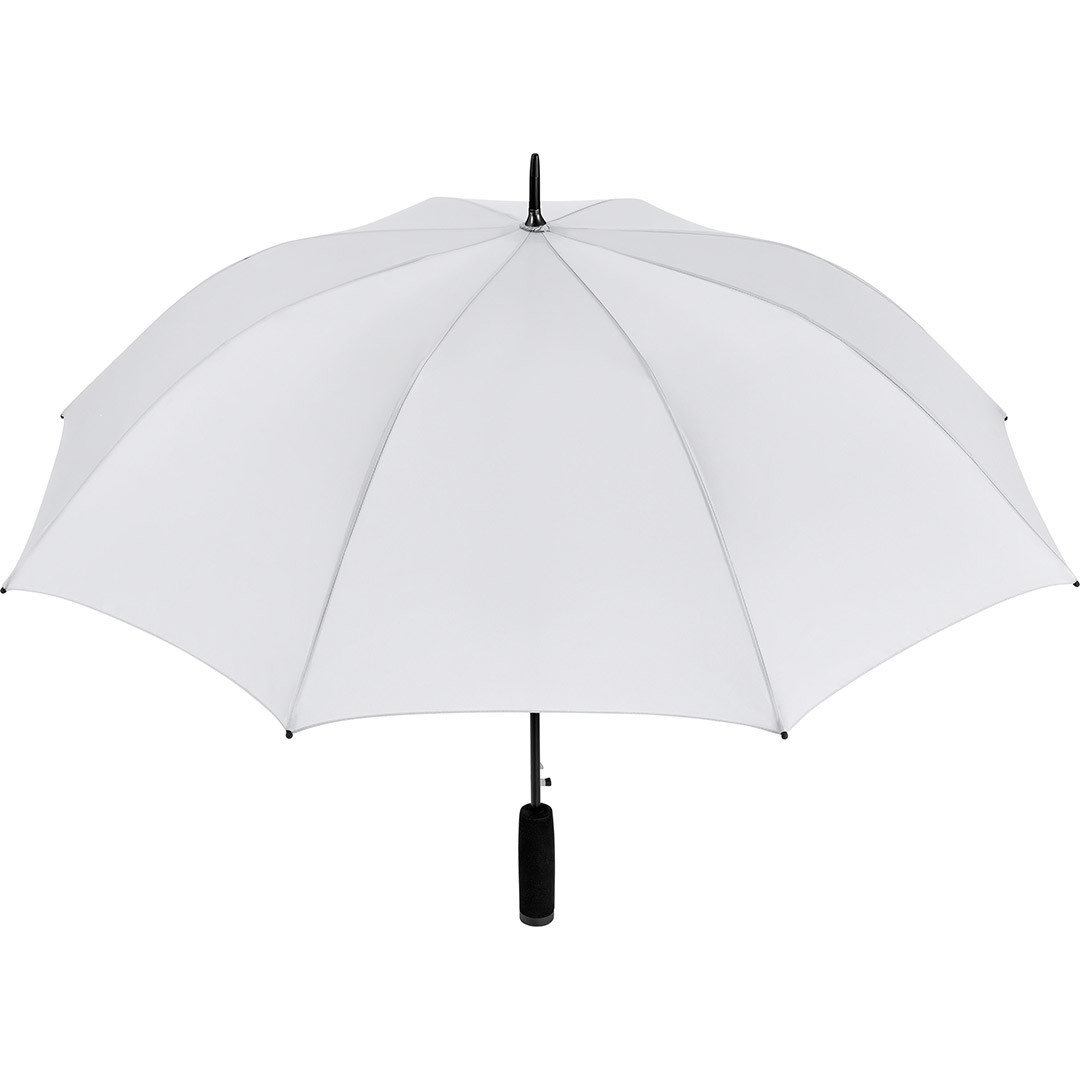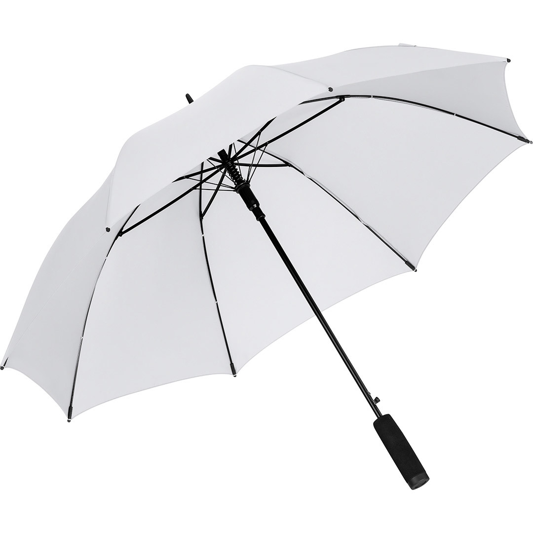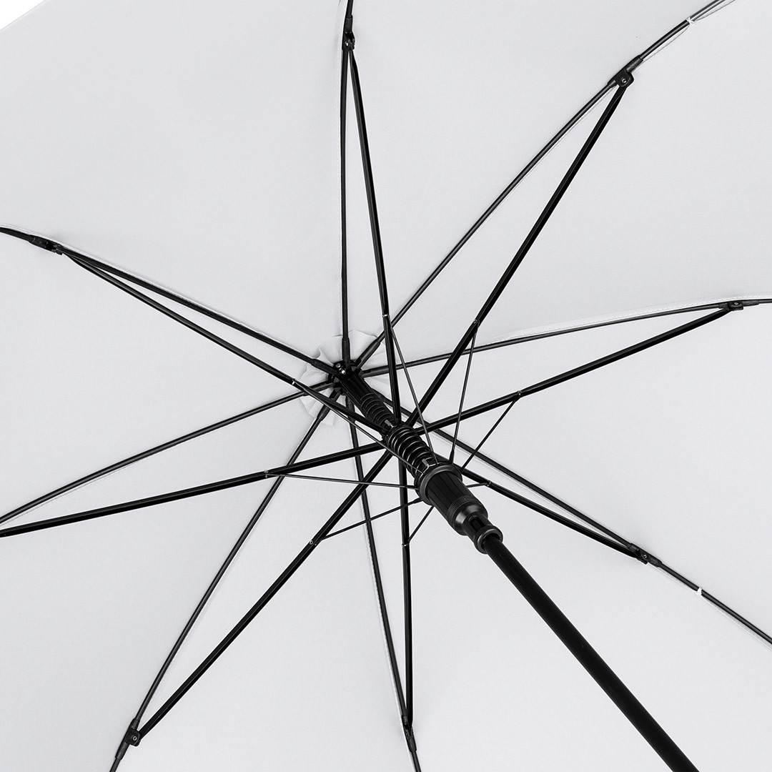 Convenient automatic function for quick opening, Windproof system for higher frame flexibility and stability in windy conditions, flexible fibreglass ribs, higher corrosion protection thanks to black galvanisation of the steel shaft, comfortable soft handle with promotional labelling option