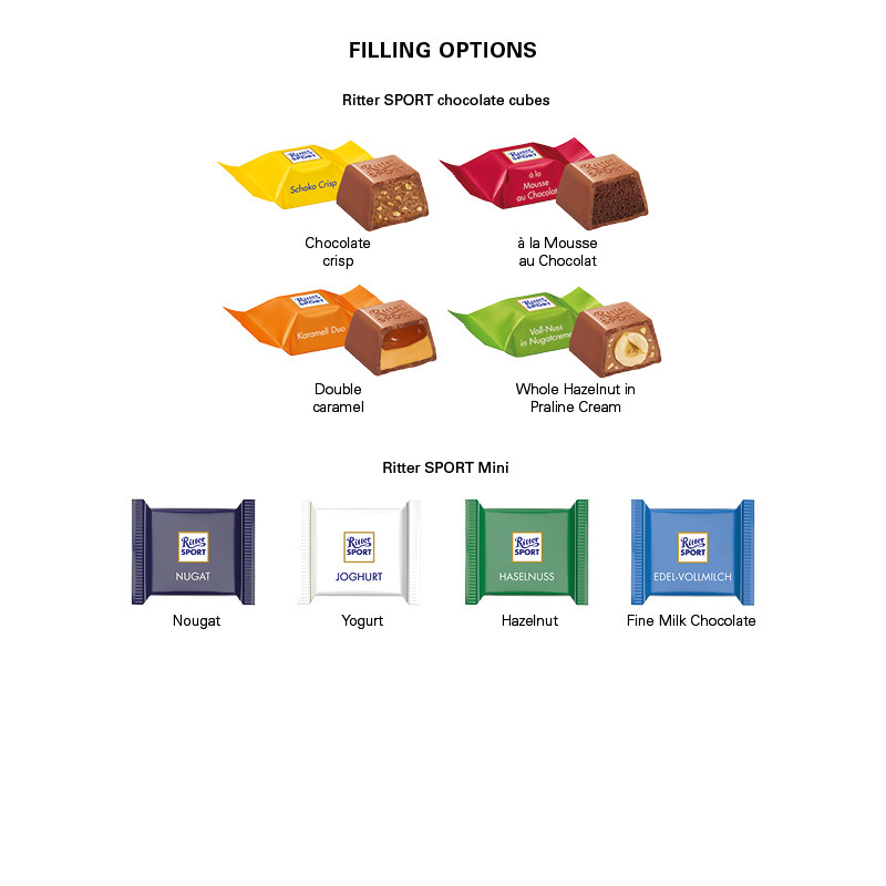 Quadratischer Adventskalender mit aufgeklebtem Deckblatt und kompostierbarem Tiefziehteil in Créme-Weiß, individuell bedruckt. Inhalt: 24 Ritter SPORT Schokowürfel, variierende Mischung aus den Sorten : Schoko Crisp, Mousse au Chocolat, Vollnuss in Nugatcreme, Karamell Duo 192 g Saisonartikel - solange der Vorrat reicht! Preise zzgl. Einrichtkosten je Auftrag/Motiv pauschal: 109 €