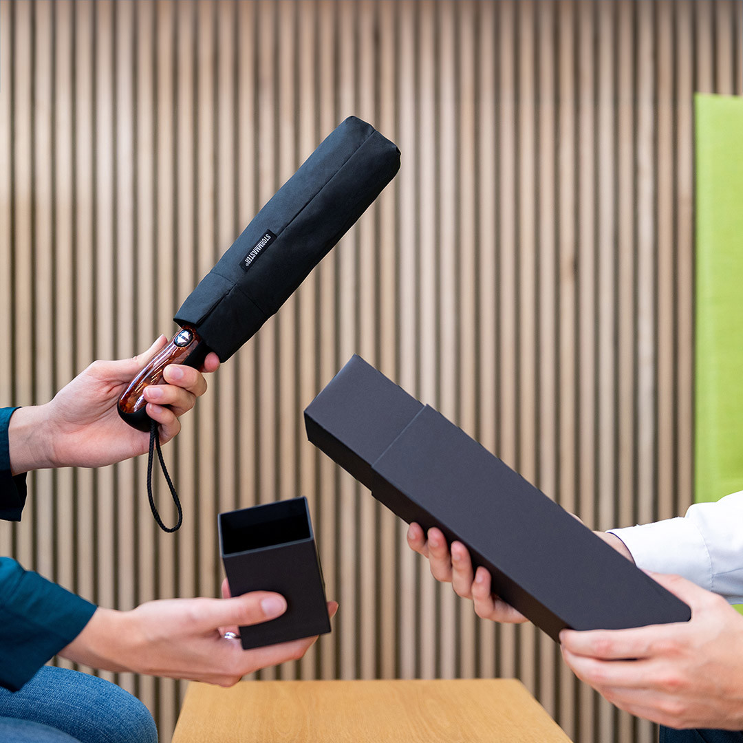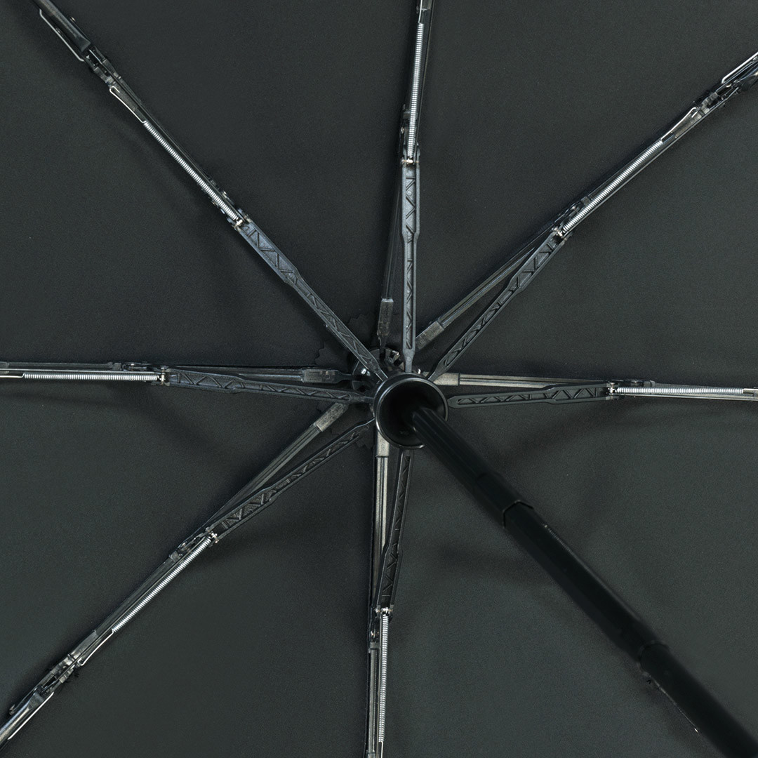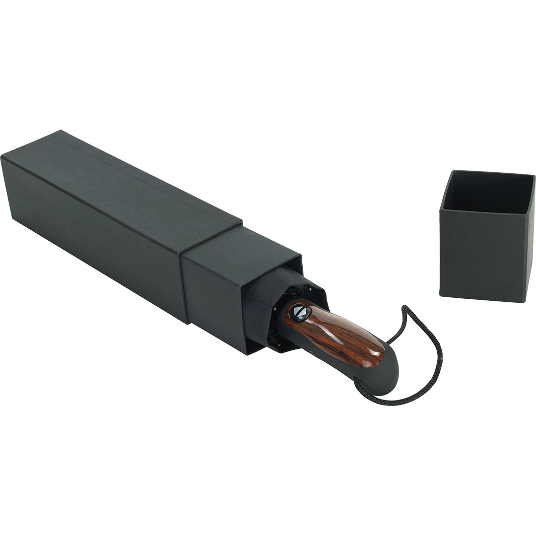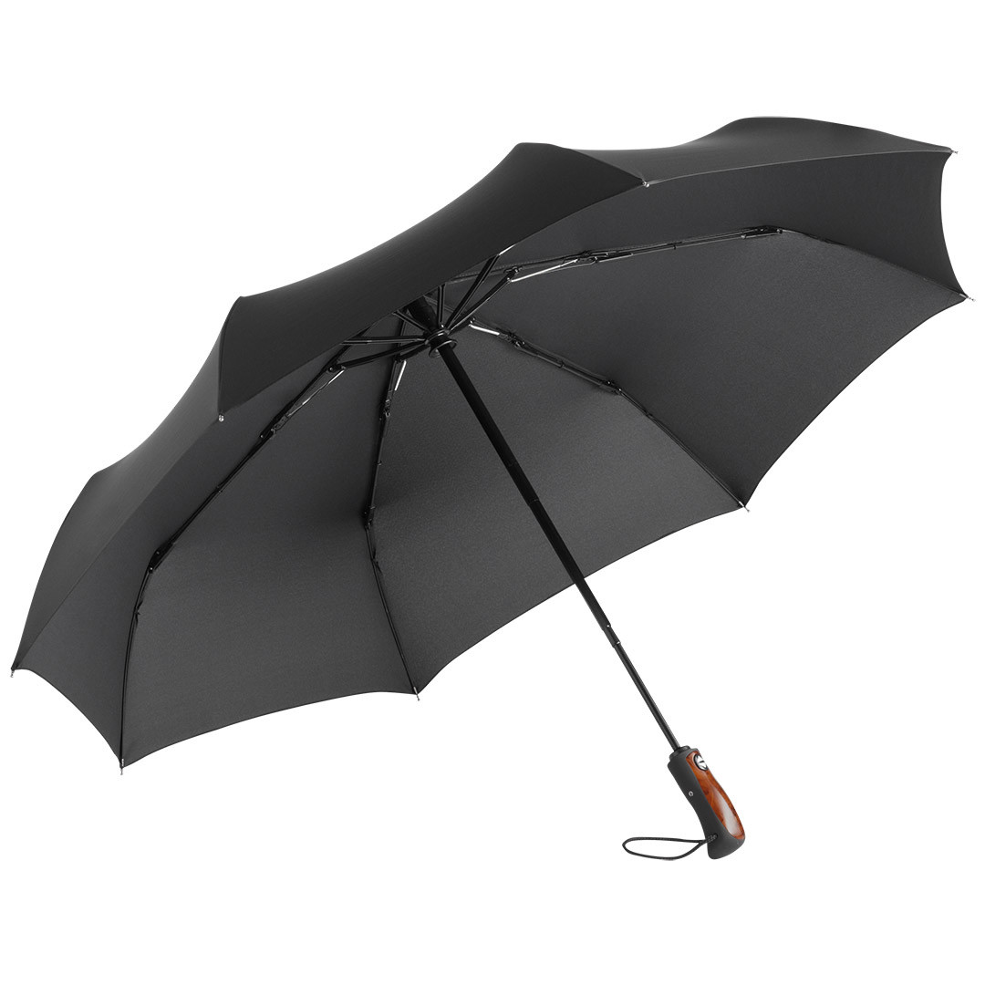 Convenient automatic open/close function for quick opening and closing, high-quality Windproof PLUS system for maximum frame flexibility in stormy conditions, extremely robust special-rib construction made of plastic and fibreglass, water-saving coloured polyester pongee waterSAVE® cover material made from recycled plastics, with waterSAVE® label on the closing strap, Soft-Feel handle with elegant insert in wooden look and integrated push-button, single packed in a high-quality gift box