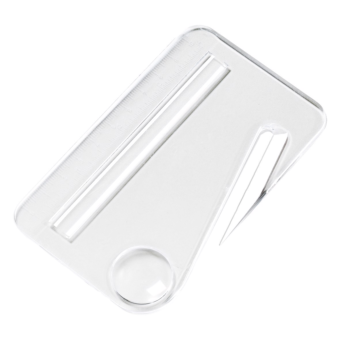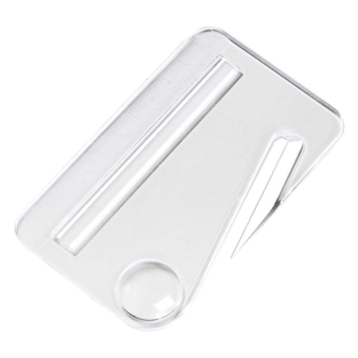 Brieföffner im Scheckkartenformat mit Kreis- und Zeilen-Lupe sowie Lineal mit 10 cm und 4 Zoll Skalierung.