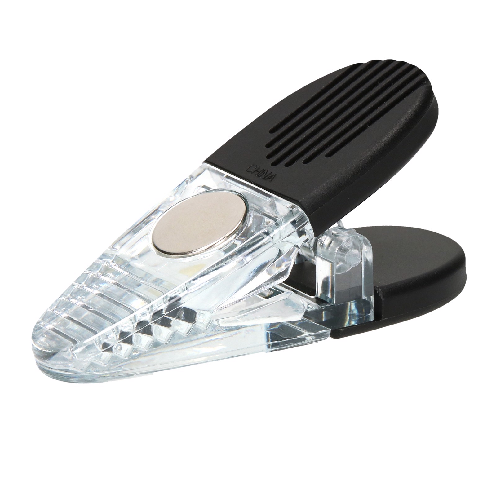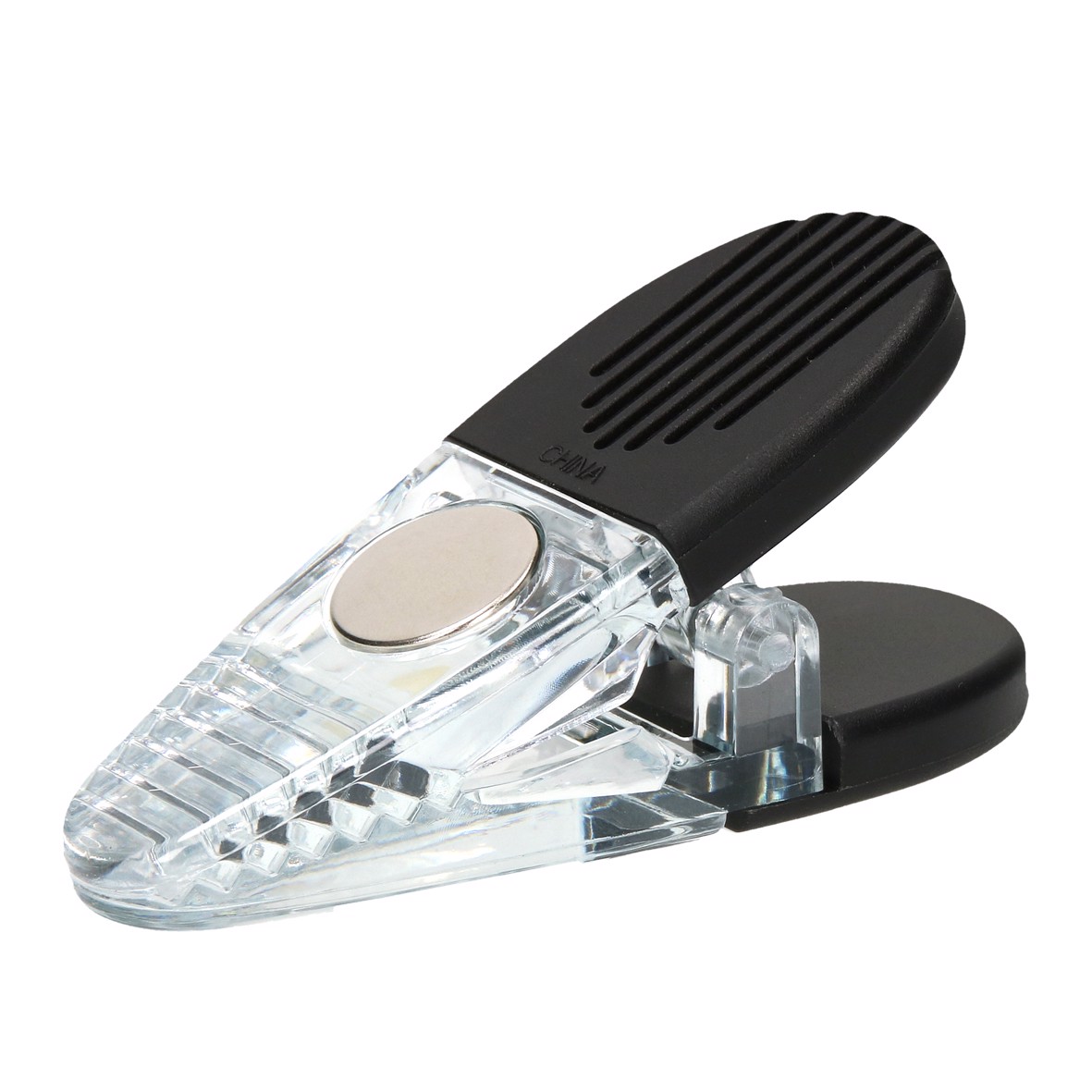 Extra große Kunststoff-Klammer aus transparentem PS und schwarzem PP mit integriertem Magneten an der Unterseite zum Befestigen von Notizen am Kühlschrank und anderen metallischen Gegenständen. Durch die gezackte Innenseite der Klammer halten die Notizen besonders gut.