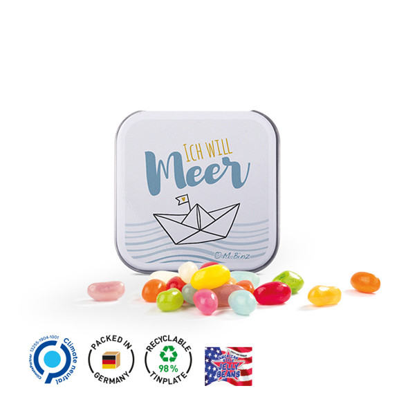 Quadratische weiße Metalldose mit Scharnierdeckel, Weißblech 98% recycelbar, individuell bedruckt. Inhalt: American Style Jelly Beans, bunt gemischt 25 g Preise zzgl. Einrichtkosten je Auftrag/Motiv pauschal: 109 €