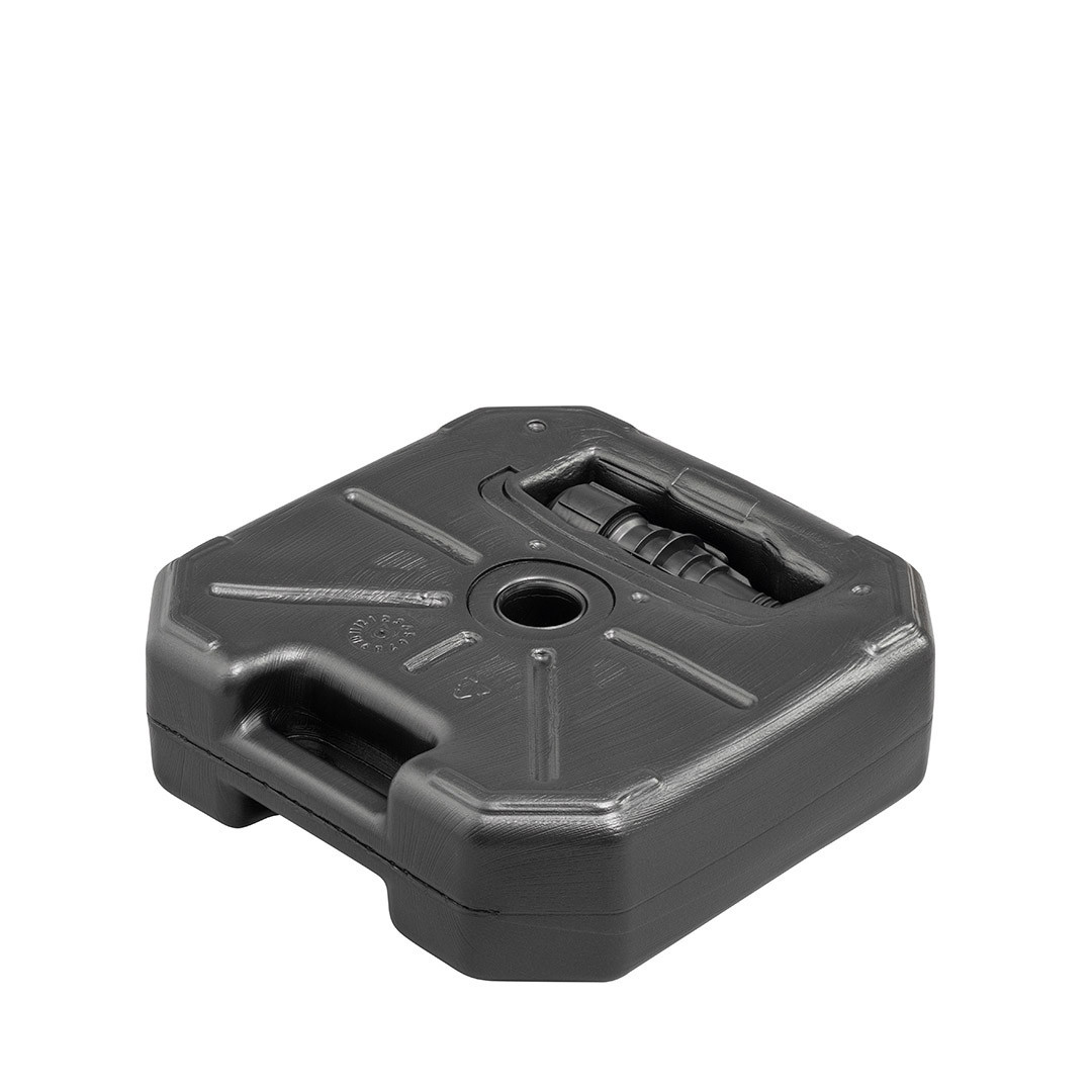 Stabiler Handgriff für einfachen Transport, befüllbar mit ca. 17 Liter Wasser oder 26 kg Sand, maximale Standfestigkeit wird erst bei kompletter Füllung erreicht, für Stöcke 14 - 31 mm Ø, Leergewicht: 750 g