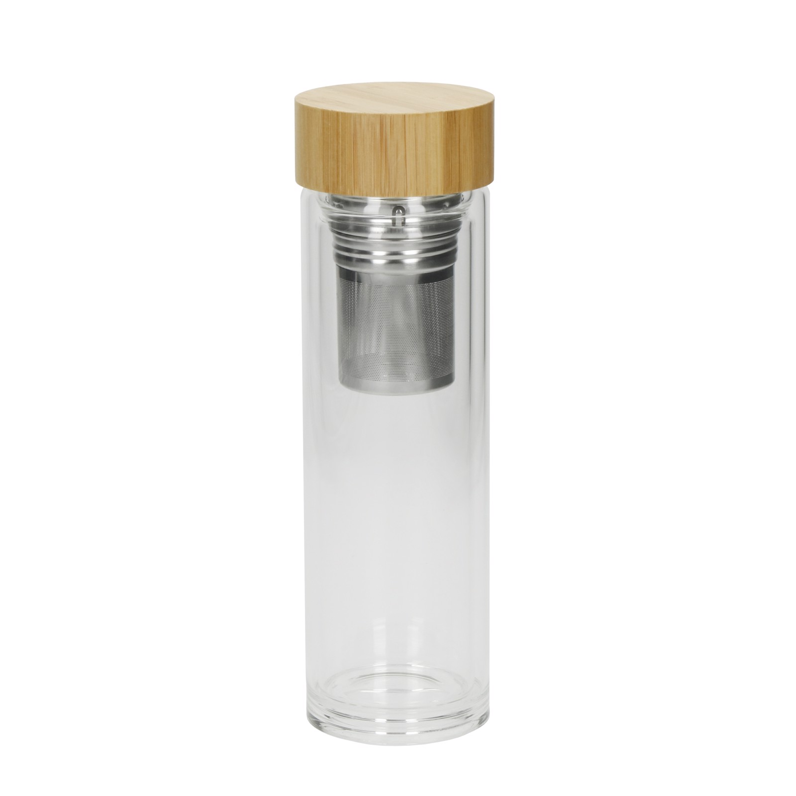 Schöne Glasflasche mit integriertem Teesieb. Im Inneren der Flasche aus Borosilikat-Glas ist ein Teesieb aus Edelstahl befestigt. Verschließen lässt sich die Flasche mit einem eleganten Bambusdeckel mit Silikondichtung. Sie lässt sich komplett auseinander nehmen und dadurch leicht reinigen. Füllmenge: ca. 0,45 Liter.