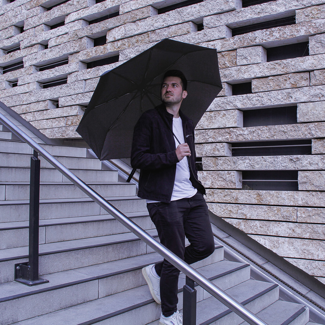Convenient automatic open/close function for quick opening and closing, high-quality Windproof PLUS system for maximum frame flexibility in stormy conditions, flexible fibreglass ribs, water-saving dyed polyester pongee waterSAVE® cover material made of recycled plastics, with waterSAVE® label on the closing strap, matt black soft-feel handle, packed in a flexible EVA case with high-quality FARE zipper