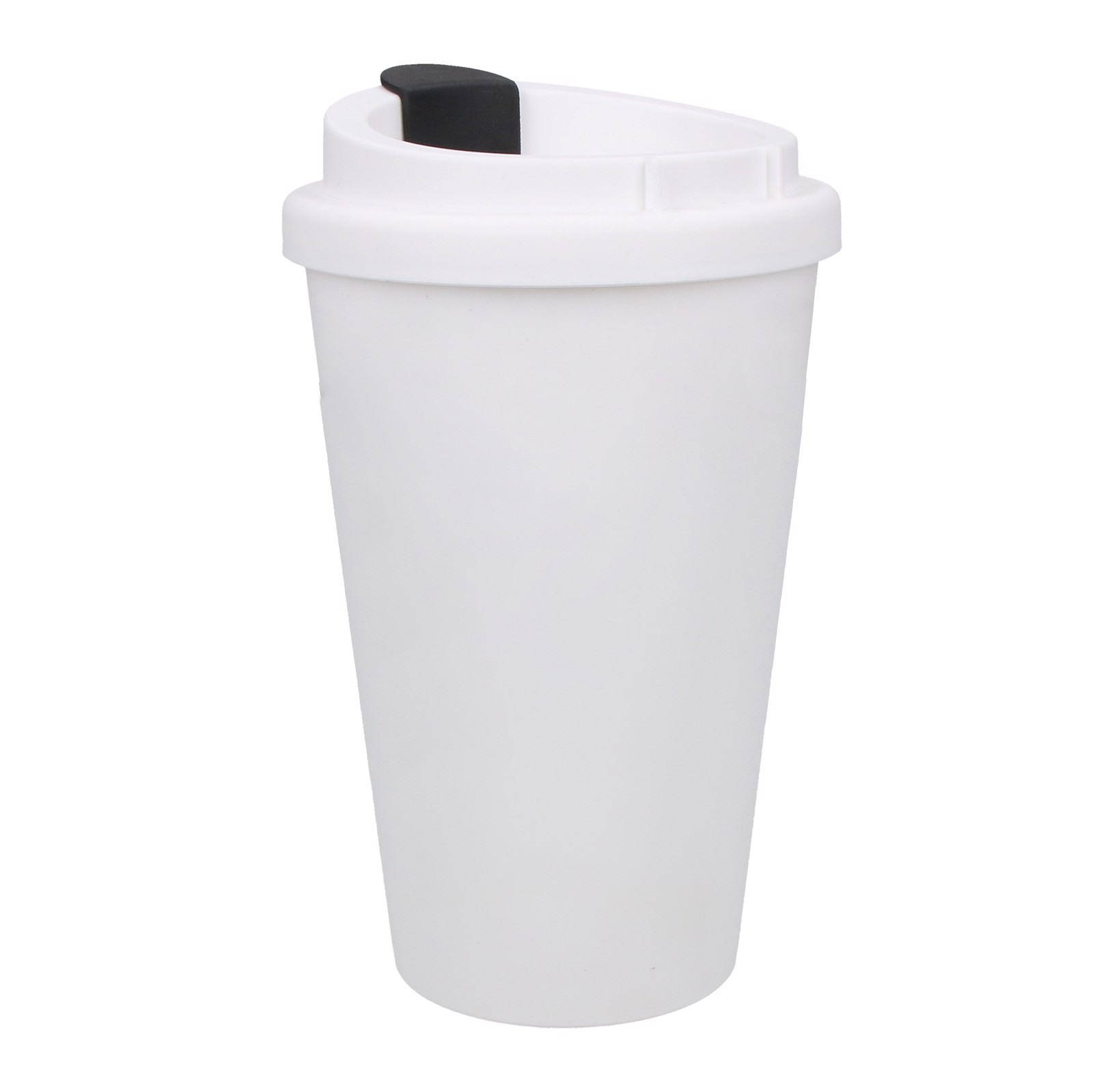 Großzügiger To-Go-Becher aus doppelwandigem Kunststoff inkl. aufsteckbarem Deckel mit Trinköffnung. Der Deckel lässt sich mithilfe der flexiblen Lasche verschließen. Zudem lässt sich diese auch am Deckelrand befestigen. Passt in alle gängigen Getränkehalter in PKW. Füllmenge: 0,35 Liter.