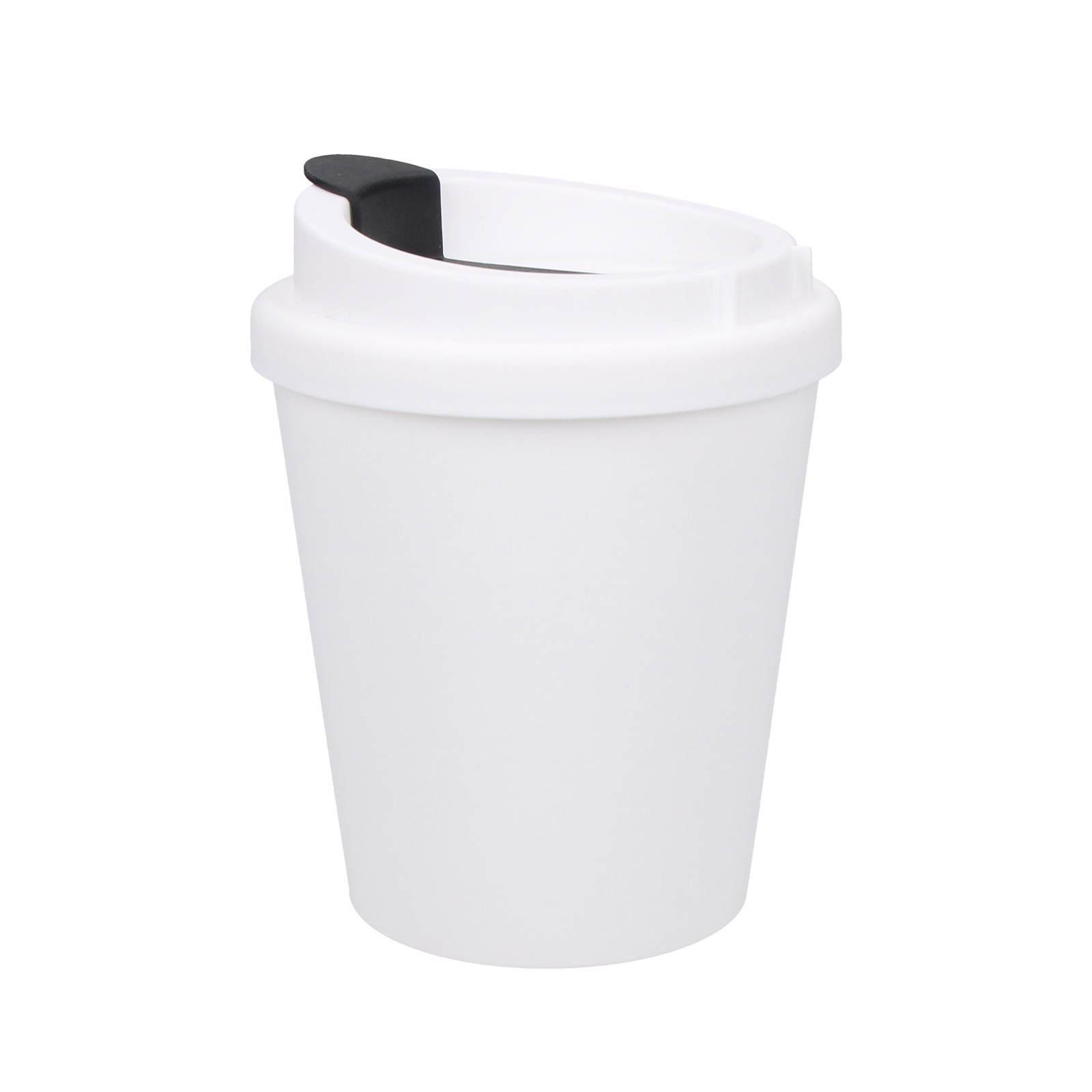 Kompakter To-Go-Becher aus doppelwandigem Kunststoff inkl. aufsteckbarem Deckel mit Trinköffnung. Der Deckel lässt sich mithilfe der flexiblen Lasche verschließen. Zudem lässt sich diese auch am Deckelrand befestigen. Passt in alle gängigen Getränkehalter in PKW. Füllmenge: 0,25 Liter.