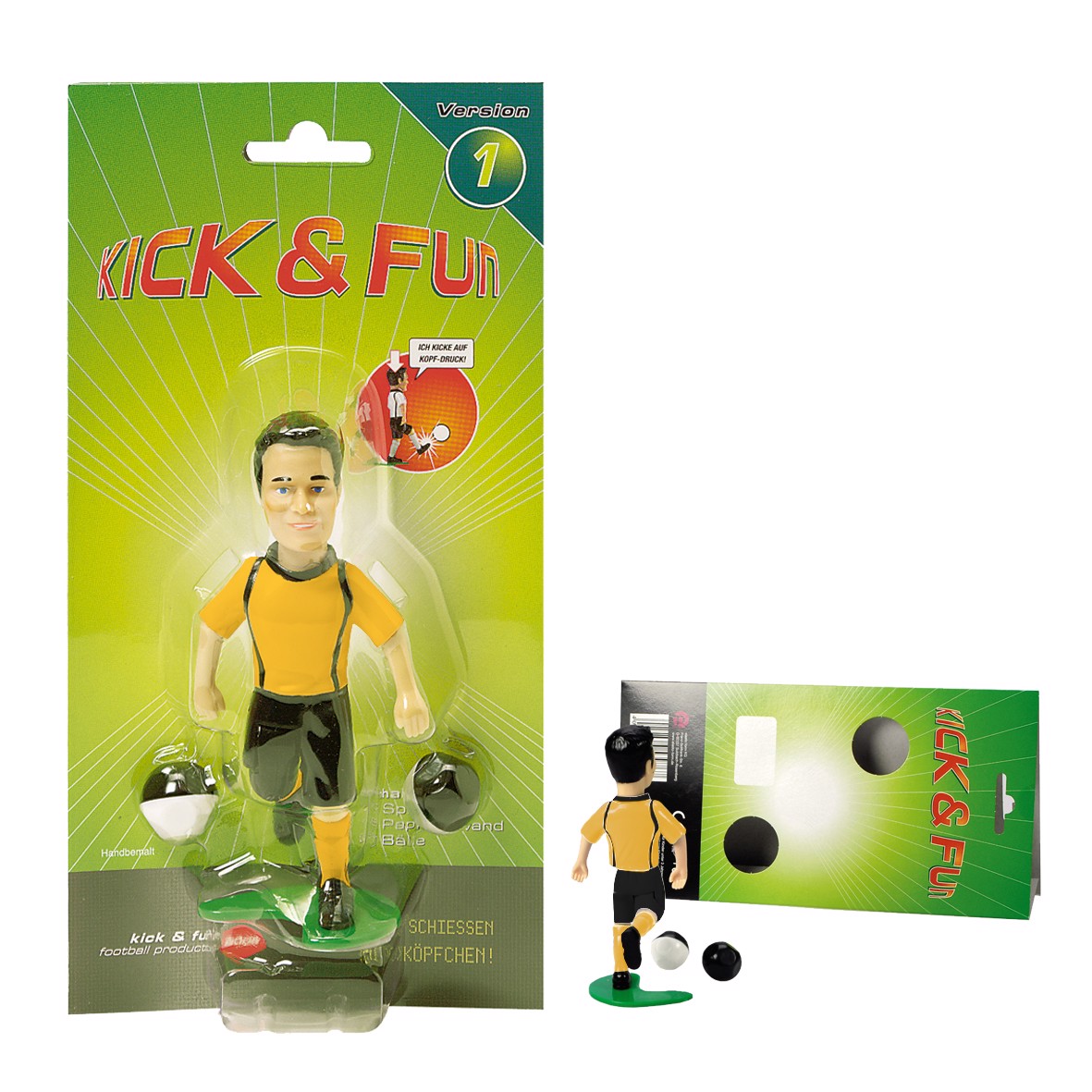 Inhalt: 1 Spielfigur (12 cm), 2 Bälle und 1 Papptorwand. Druck im Werbefeld auf dem Karton möglich.