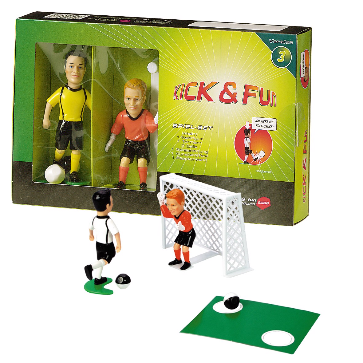 Inhalt: 1 Spielfigur (12 cm), 1 Tormann (12 cm), 2 Bälle, 1 Papptorwand, 1 Kunststofftor und 1 Spielanleitung. Druck im Werbefeld auf dem Karton möglich.