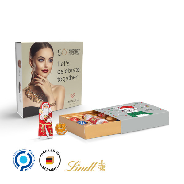 Lindt Mischung Weihnachten im Standard-Werbeschuber aus weißer Kartonage, individuell bedruckt. Inhalt: Lindt kleine Kostbarkeiten Santa mit 7 LINDOR Mini Kugeln, bunt gemischt und 1 Weihnachtsmann 42 g Saisonartikel - solange der Vorrat reicht! Preise zzgl. Einrichtkosten je Auftrag/Motiv pauschal: 109 €