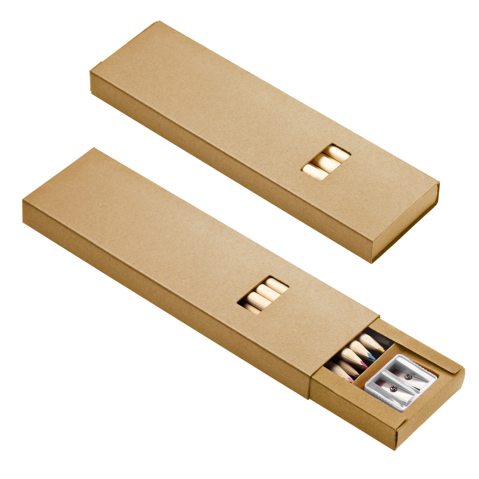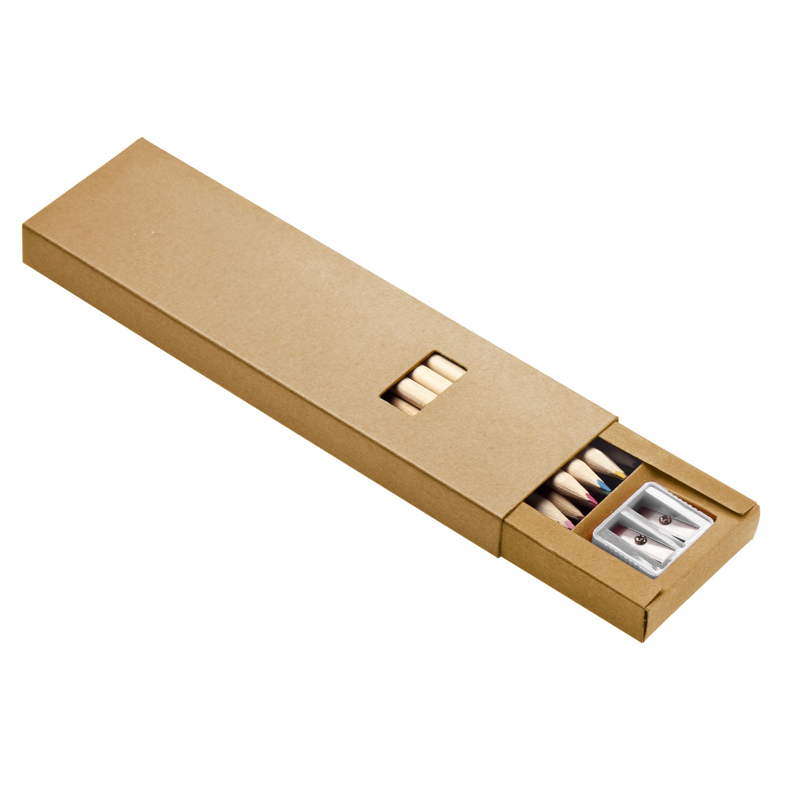 12 lange, unlackierte Buntstifte in dreieckiger Form und 1 weißer Spitzer für dünne und dicke Stifte, verpackt in einem Schuber aus naturfarbenem Karton (400g).