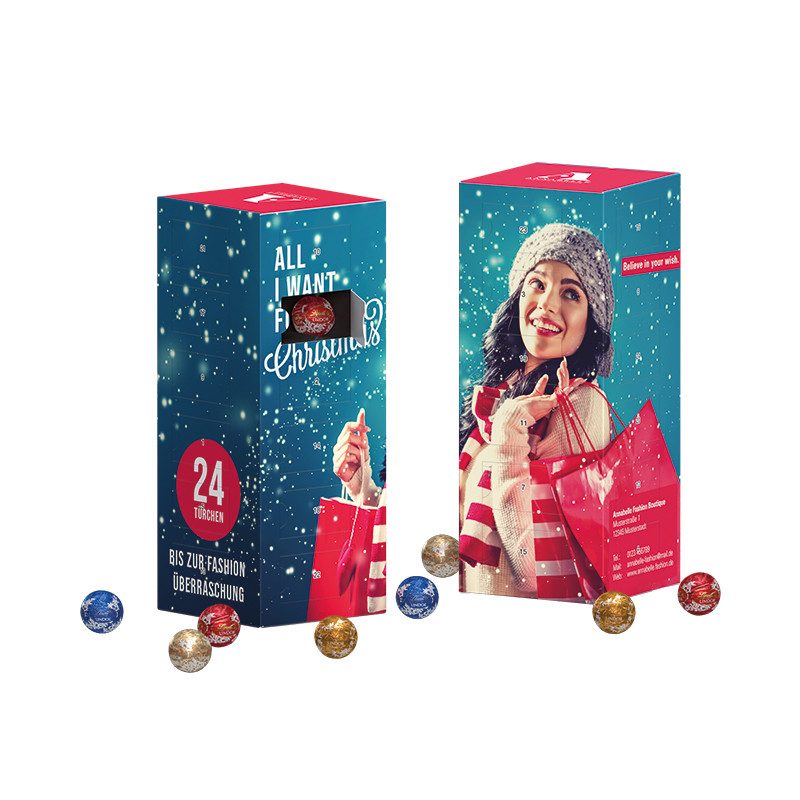 Adventskalenderturm mit kompostierbarem Inlay, rundum individuell bedruckt. mit 5 Werbeflächen. Inhalt: 24 LINDOR Mini Kugeln von Lindt, bunt gemischt, 109 g Saisonartikel - solange der Vorrat reicht!