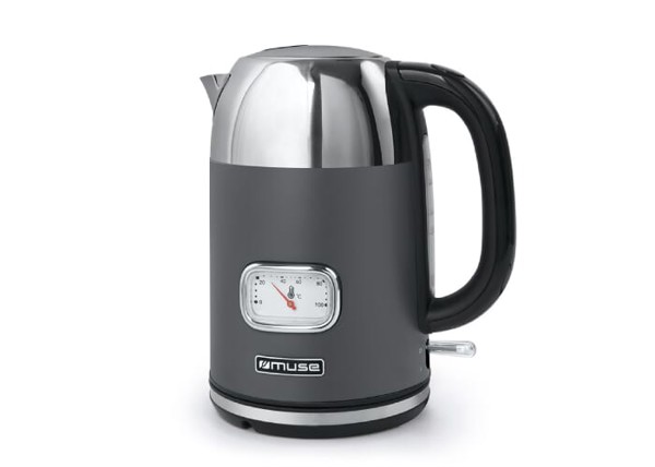 Dieser stilvolle Wasserkocher von Muse hat ein Fassungsvermögen von 1,7 Litern. Dieser Wasserkocher im Retro-Stil kombiniert moderne Technologie mit Vintage-Design. Er verfügt über eine Wasserstandsanzeige und eine analoge Temperaturanzeige. Auch an die Sicherheit wurde gedacht: Der Wasserkocher schaltet sich automatisch ab, wenn kein Wasser im Gerät ist und wenn das Wasser kocht.