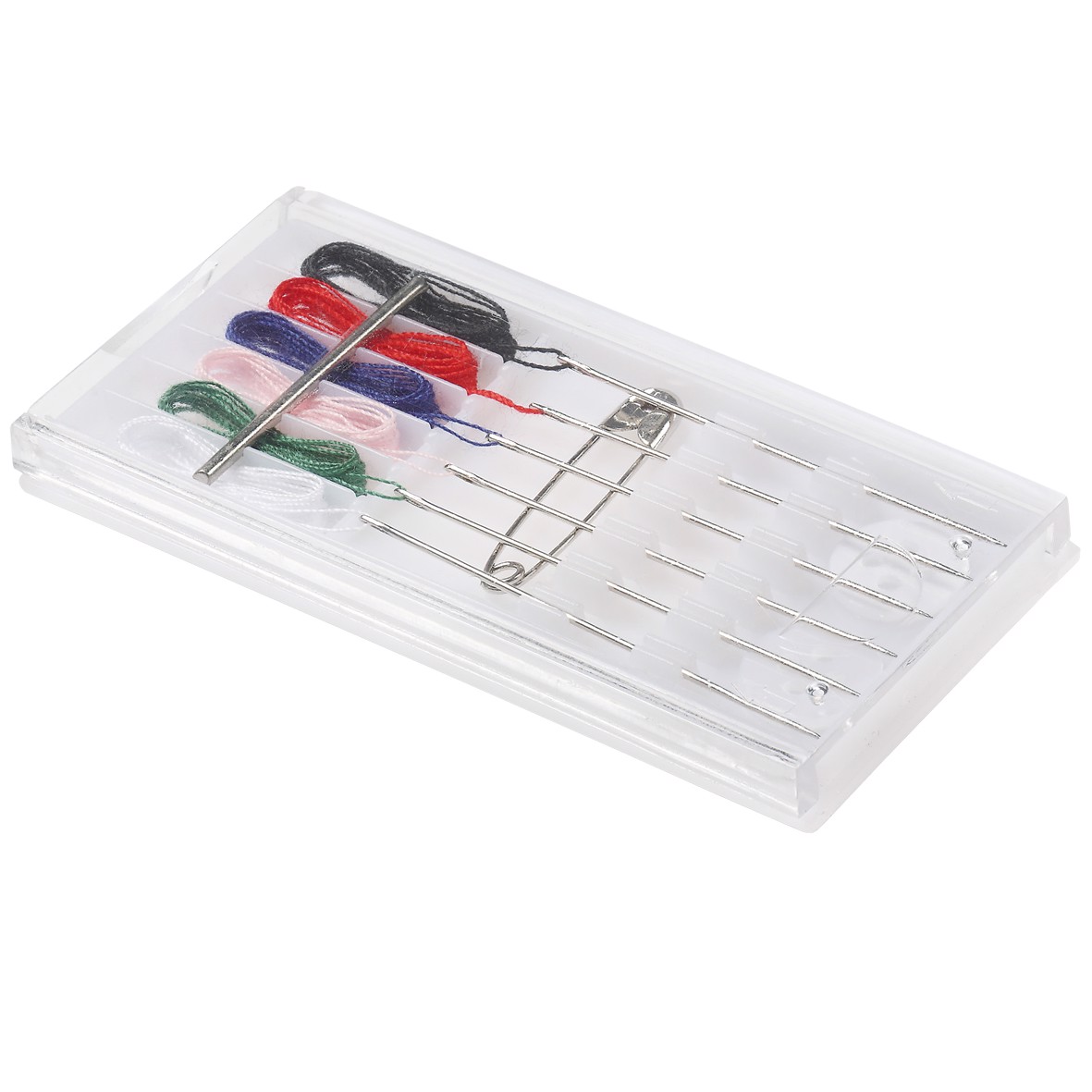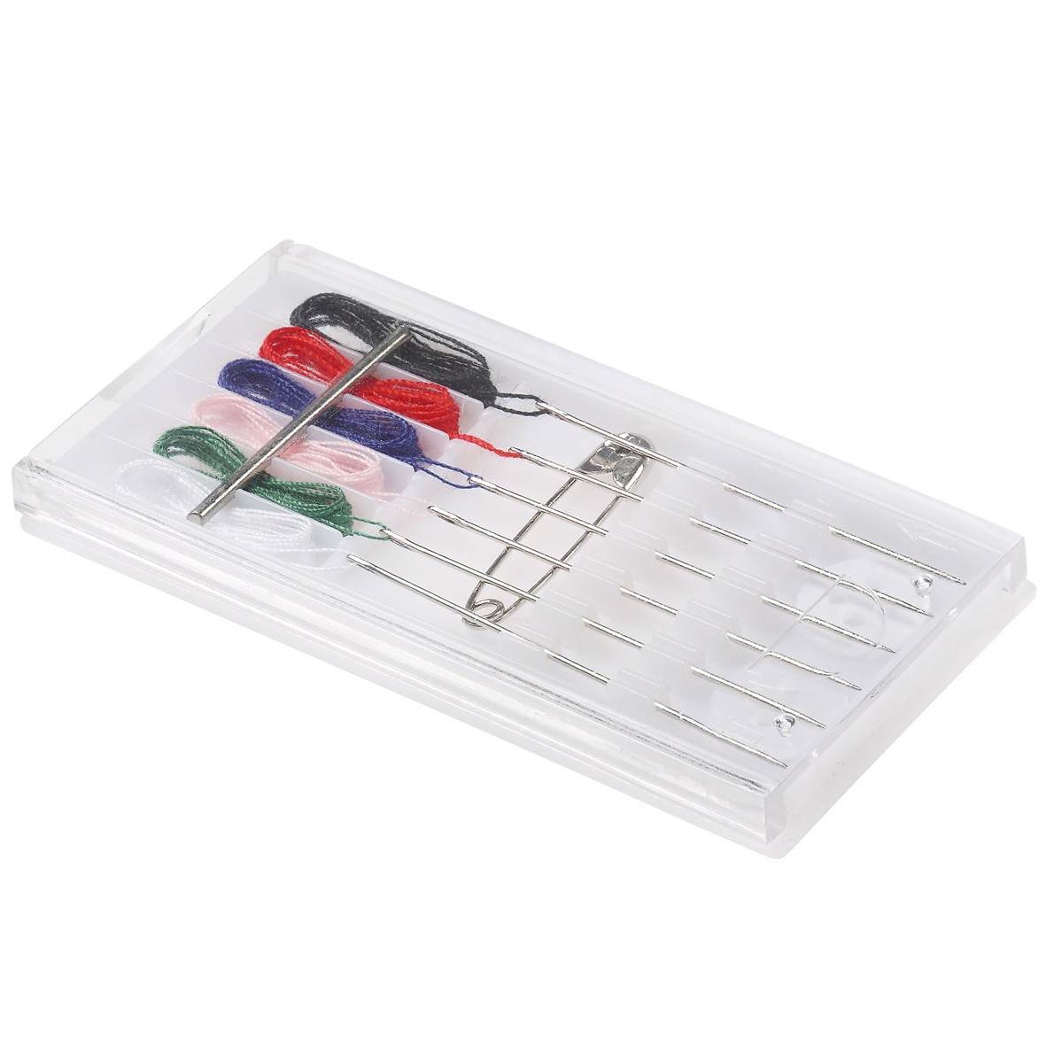 Extra handliche und äußerst praktische Version mit 2 weißen Knöpfen, 1 Sicherheitsnadel und 6 Nähnadeln mit bereits eingefädeltem Garn in weiß, grün, rosa, dunkelblau, rot und schwarz.