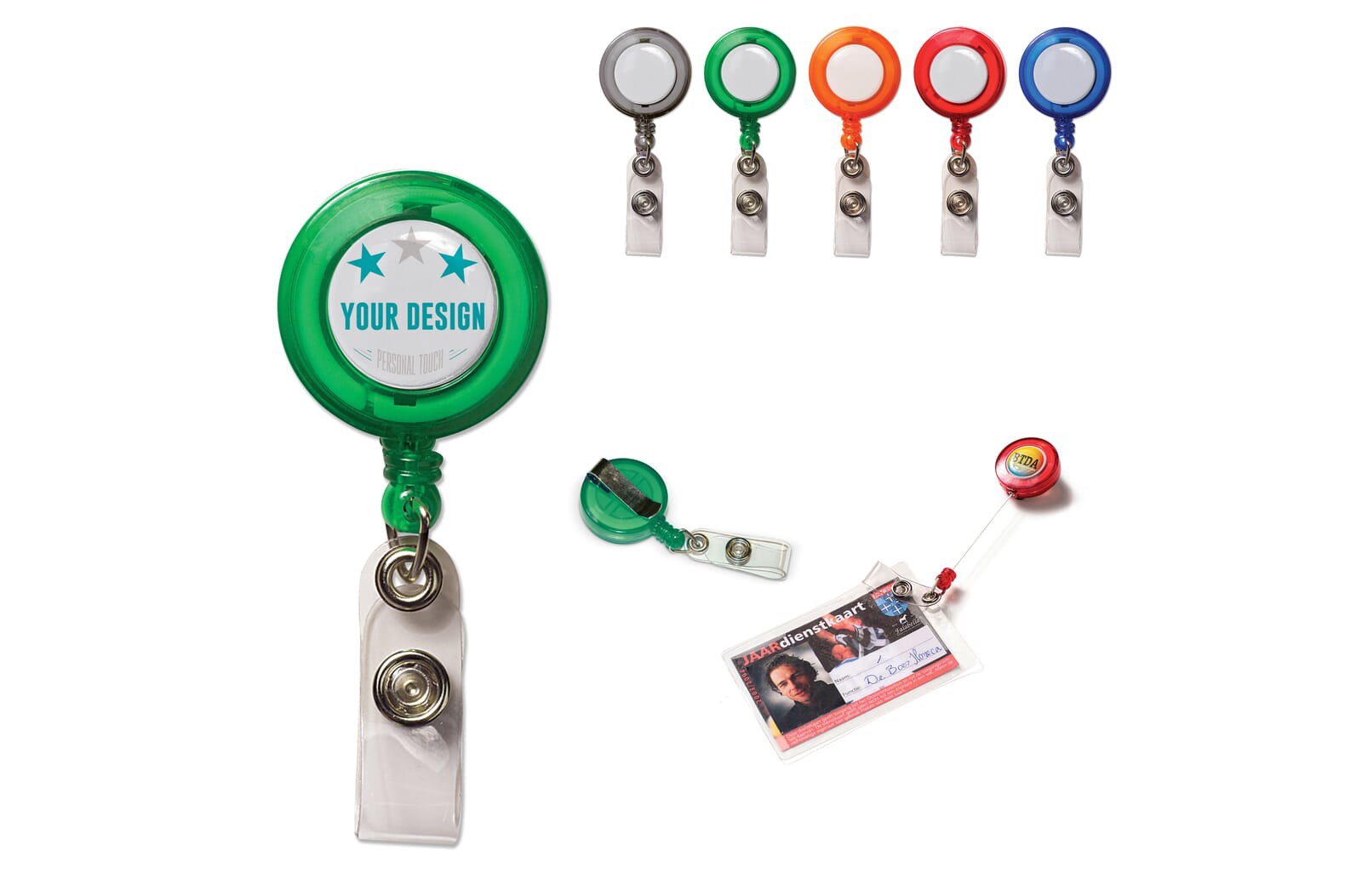 Transparenter Namensschildhalter mit Ausziehband: 50cm und Clip auf der Rückseite. Werbeanbringung mittels Doming.