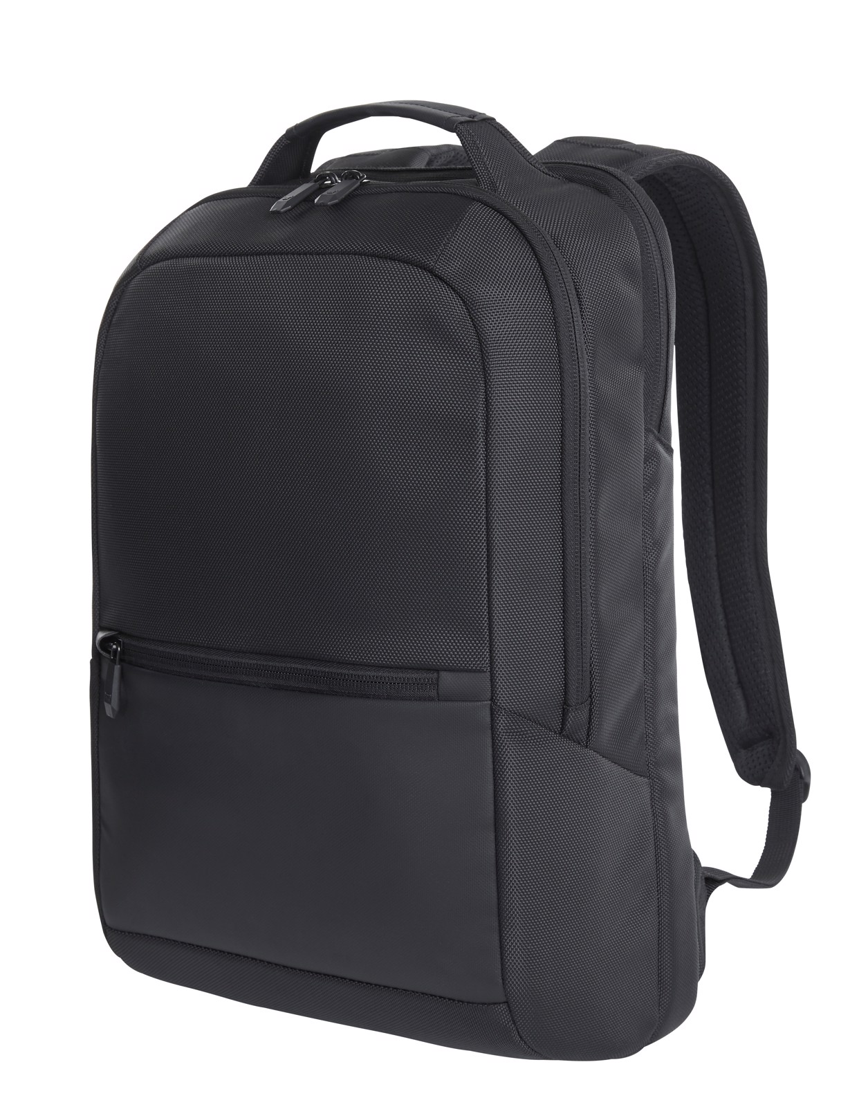 Eleganter, geradlinig gearbeiteter Businessrucksack; gepolstertes 2-Wege-Reißverschluss-Hauptfach mit Organizer-Elementen, gepolstertem Einsteckfach und Reißverschluss-Netzfach; großes, separat zugängliches, gepolstertes Notebookfach mit Kabeldurchlass zum Hauptfach; Reißverschluss-Vortasche; aufwendig gepolsterter Rücken; gepolsterte Befestigungsschlaufe für Trolley-Gestänge; längenverstellbare, gepolsterte Schultergurte; verstärkter Handgriff