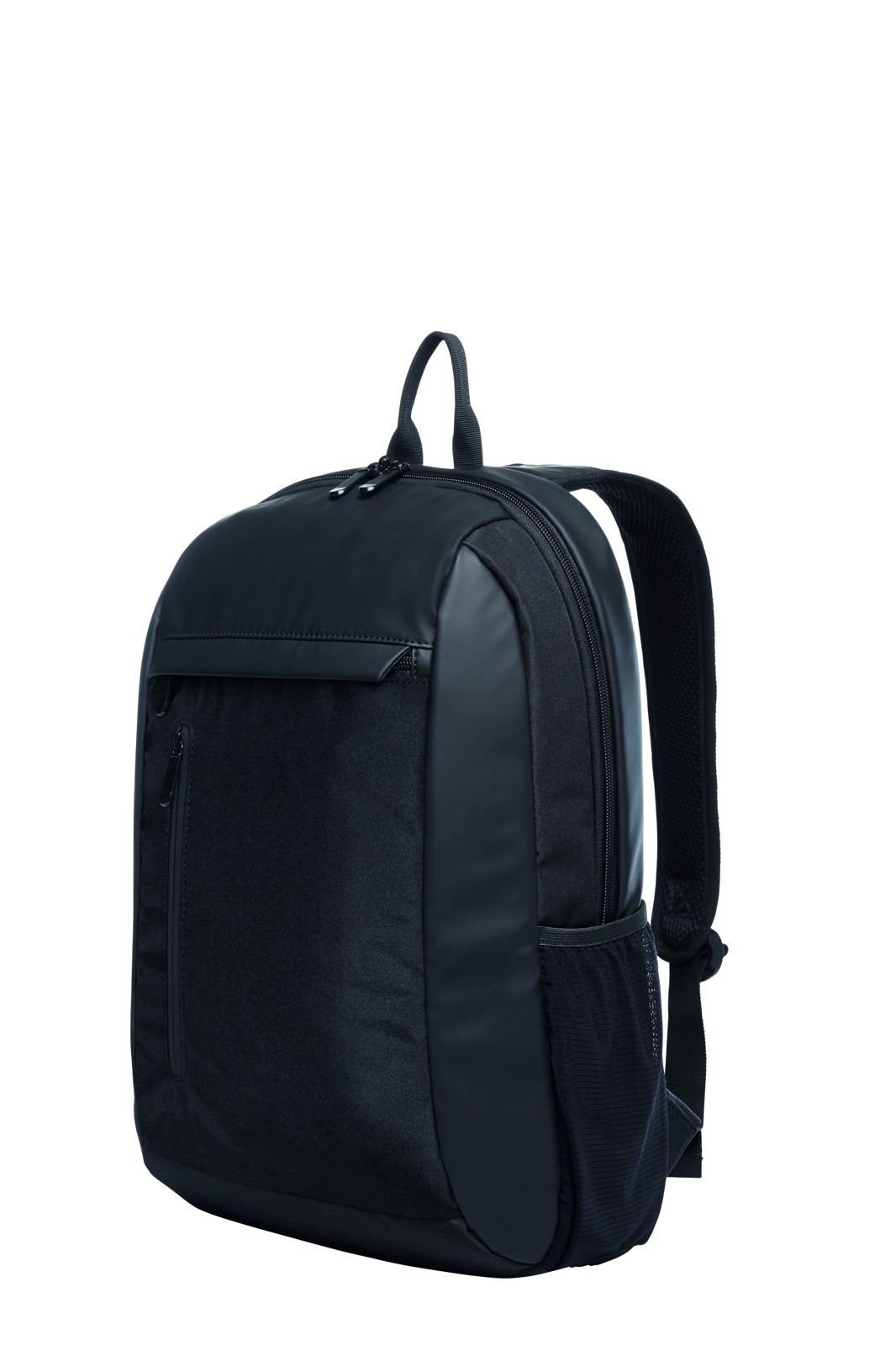 Moderner, aufwändig gearbeiteter Notebook-Rucksack; Hauptfach mit 2-Wege-Reißverschluss (abschließbar); gepolstertes Notebookfach und Organizer-Funktion innen; zwei Reißverschluss-Vortaschen; seitliche Netzfächer; gepolsterter Rücken; gepolsterte, längenverstellbare Schultergurte