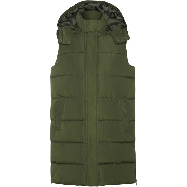 Wattierte Weste mit abnehmbarer Kapuze. Hoher Kragen. Reißverschluss auf der Vorderseite, verdeckt durch eine Patte. Zwei Taschen mit Druckknopfverschluss. Seitliche Öffnungen mit Reißverschlüssen. Zugang zur Brust von der Innenseite. Wasserabweisend.