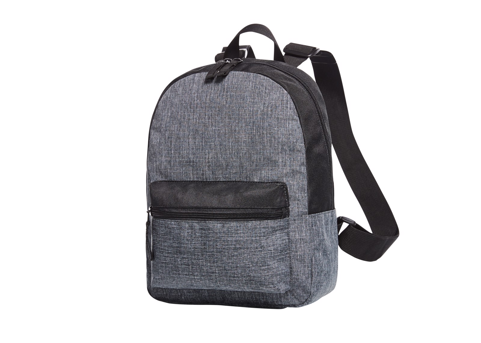 Junger, zweifarbiger Rucksack; Hauptfach mit 2-Wege-Reißverschluss; flaches, gepolstertes Einsteckfach innen; Reißverschluss-Vortasche; gepolsterter Rücken; Accessoire-Lasche; längenverstellbare Schultergurte; Handgriff