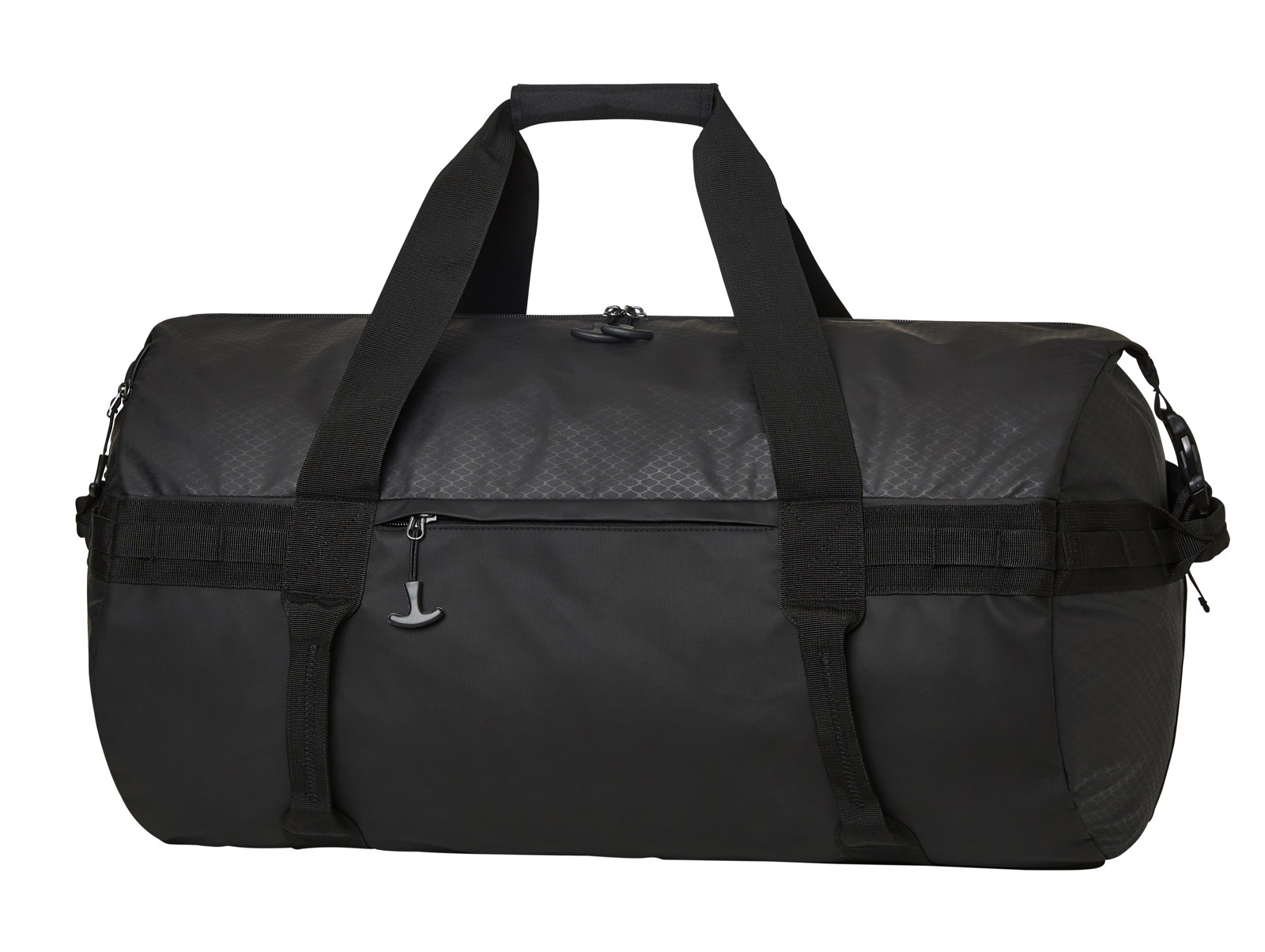 Komfortable Sport-Reisetasche mit Rucksackfunktion; geräumiges Hauptfach mit 2-Wege-Reißverschluss und seitlichen Steckverschlüssen; seitliches Reißverschlussfach; Reißverschluss-Vortasche; umlaufendem Funktions- Schaufenband; diverse Handgriffe; Tragegriffe und versteckte, gepolsterte und längenverstellbare Schultergurte
