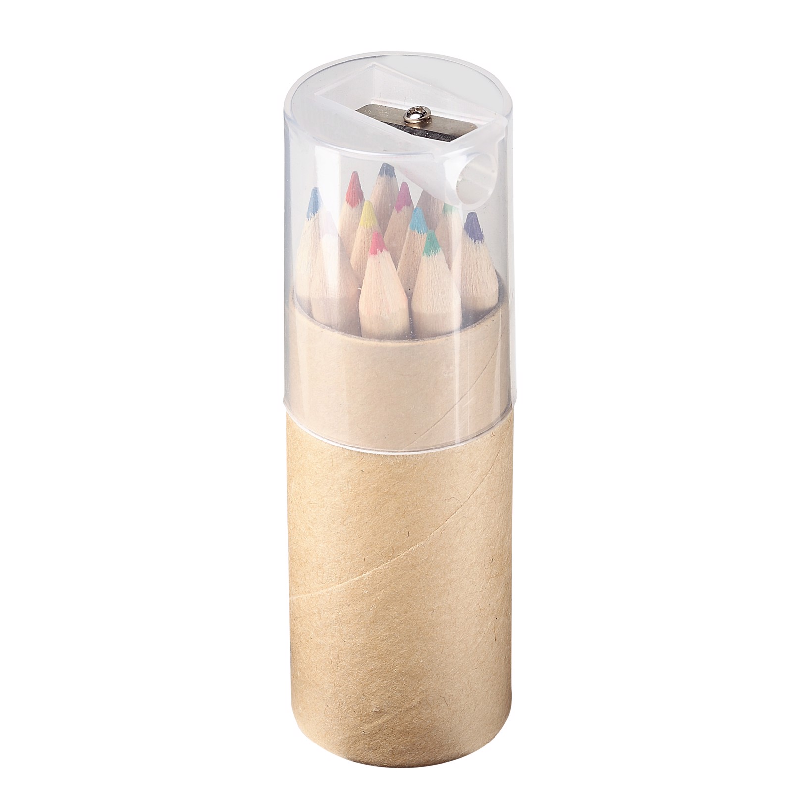 Handliches 2in1-Set mit 12 kurzen, unlackierten Holz-Buntstiften im Pappzylinder mit transparentem Kunststoffdeckel und integriertem Spitzer.