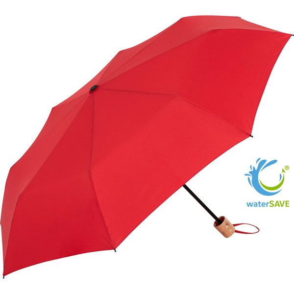 Einfache Handhabung durch Sicherheitsschieber, hochwertiges Windproof-PLUS-System für eine maximale Gestell-Flexibilität bei stärkeren Windböen, Polyester-Pongee Bezugsmaterial aus recycelten Kunststoffen, farbabhängig auch mit waterSAVE® Bezugsmaterial erhältlich, mit waterSAVE®-Label auf dem Schließband (bei neuen Chargen), Echtholzgriff mit Werbeanbringungsmöglichkeit