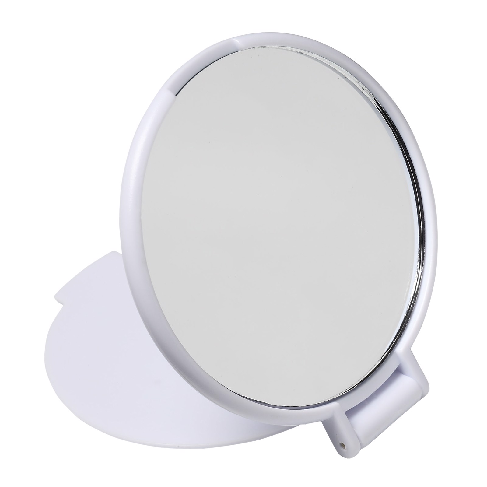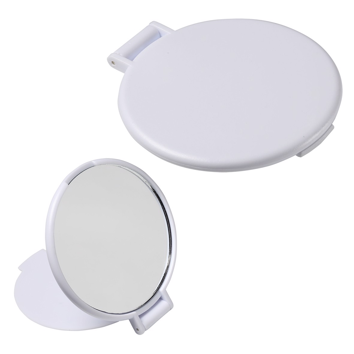 Optimal für die Hand- oder Hosentasche. Flacher, runder Taschenspiegel mit weißem Kunststoffgehäuse und aufklappbarem Deckel.