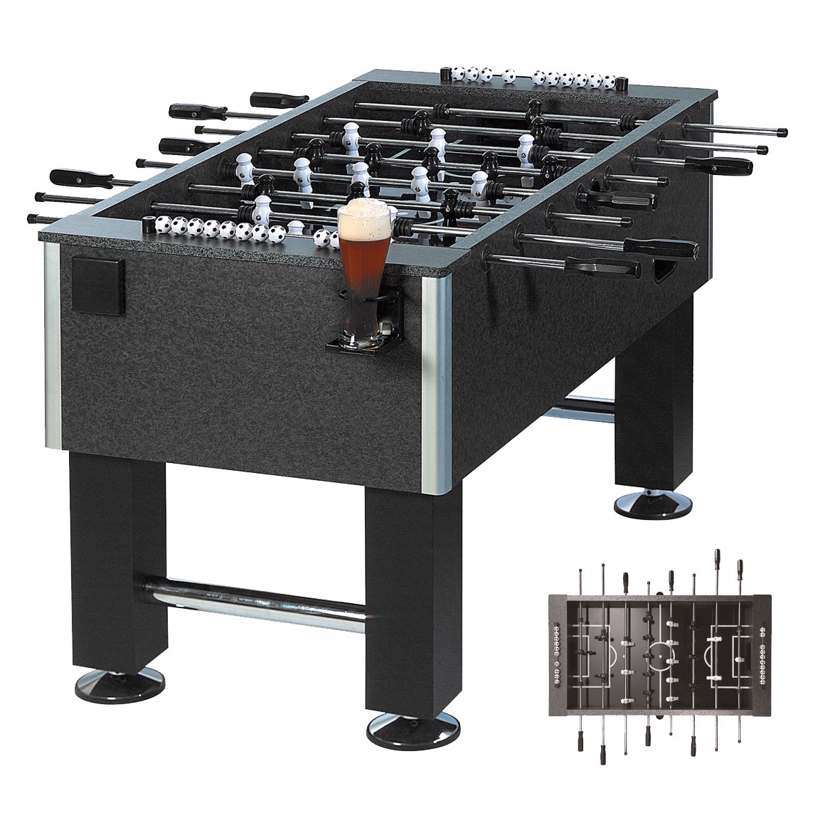 Spaß garantiert! Kickertisch inklusive Bälle und Spielfiguren. Mit Glashalterung, Zählmechanismus und abgeschrägten Ecken. Da wird jedes Spiel zum Erlebnis. Der Kickertisch wird unmontiert geliefert.