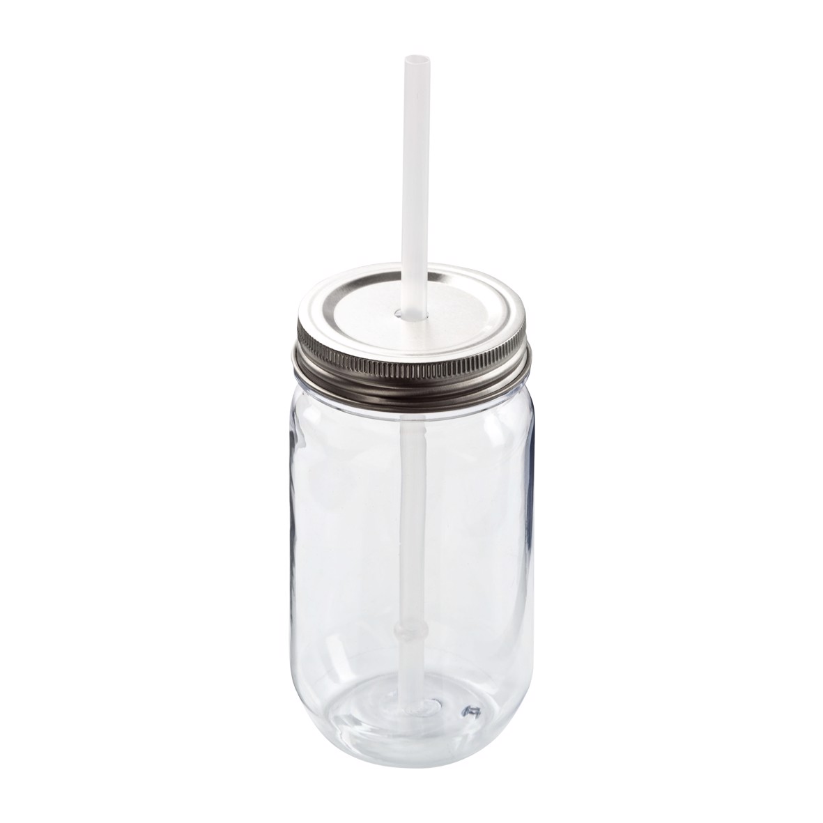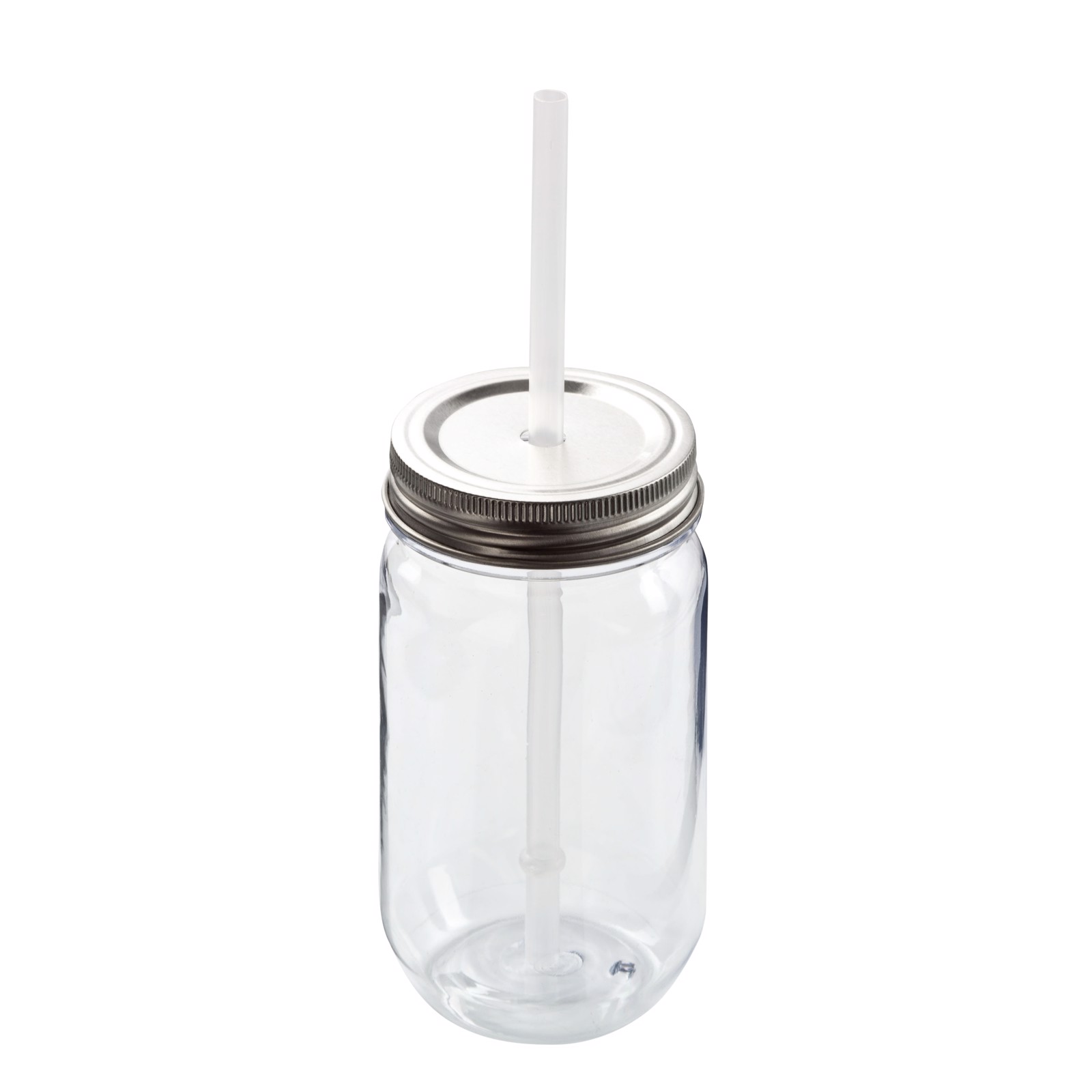 Glasklarer Becher aus bruchfestem SAN Kunststoff mit Schraubdeckel aus Blech inkl. Dichtungsring. Besonders praktisch ist der integrierte Kunststoff-Strohhalm mit Stopper am unteren Ende, der ein Herausfallen des Strohhalms verhindert. Füllmenge: 0,45 Liter.