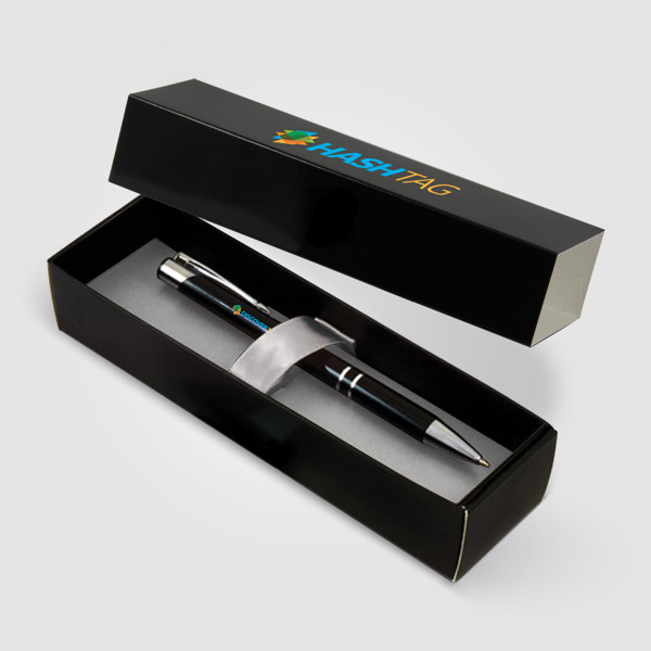 Hochwertige Geschenkbox aus Karton mit abnehmbarer Hülle und Satinschleife. Die Box hat Platz für ein oder zwei Schreibgeräte. Erhältlich in 2 Farben: Schwarz und Weiß. Kann mit einem 1-farbigen Tampondruck (Druckfarbe je nach Wahl der Schachtel) oder im Digitaldruck vollfarbig gestaltet werden.
