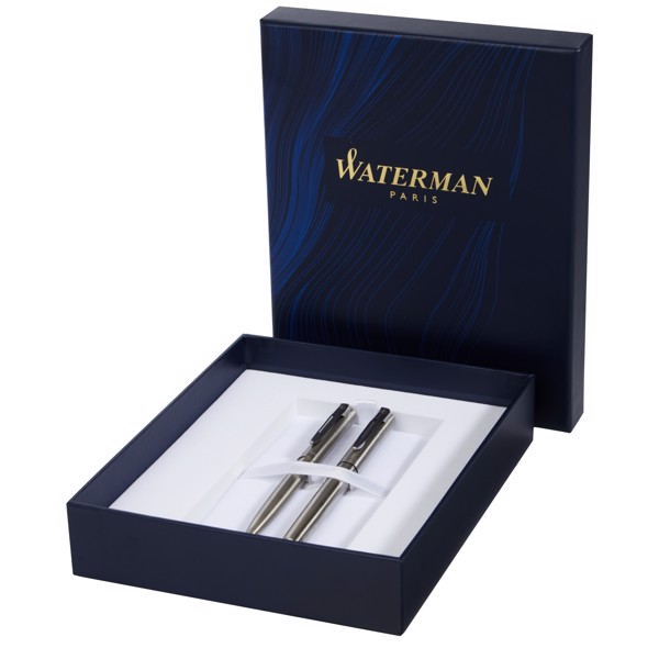 Geschenkbox für zwei Stifte, die eine Kombination von zwei verschiedenen Schreibmodi ermöglicht, um ein flexibles, feines Schreiberlebnis zu bieten. Wählen Sie zum Beispiel zwischen einer Kombination aus Kugelschreiber und Tintenroller oder Kugelschreiber und Füllfederhalter. Stifte sind nicht im Lieferumfang dieses Artikels enthalten und müssen separat bestellt werden.