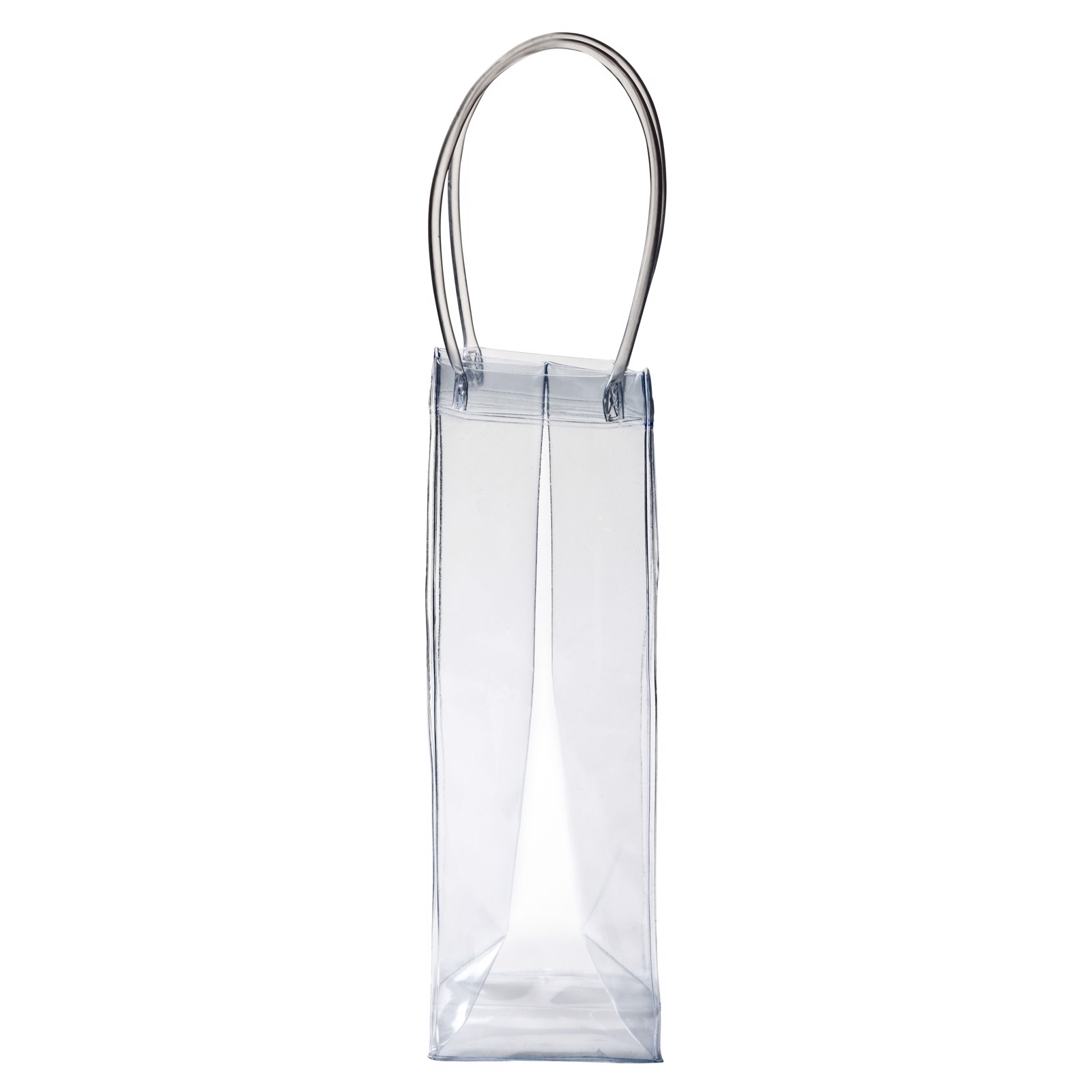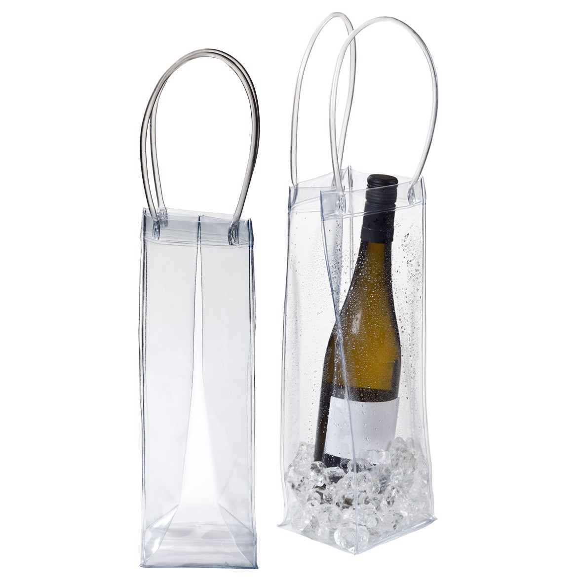 Gleichzeitig transportieren und kühlen. Tragetasche aus transparentem PVC für eine Flasche Weißwein, Sekt oder Champagner. Kann zum Kühlen des Inhalts mit Eiswürfeln befüllt werden. Auch schick als Geschenk- tasche zu verwenden.