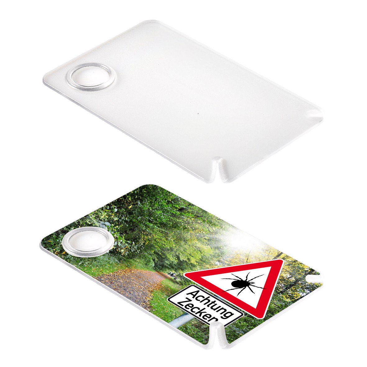 Diese praktische, flache Karte rückt den kleinen Blutsaugern auf die Pelle. Einfaches Entfernen von Zecken mittels der beiden Schlitze an den Ecken. Mit der integrierten Lupe lässt sich danach leicht feststellen, ob das Spinnentier komplett beseitigt wurde.