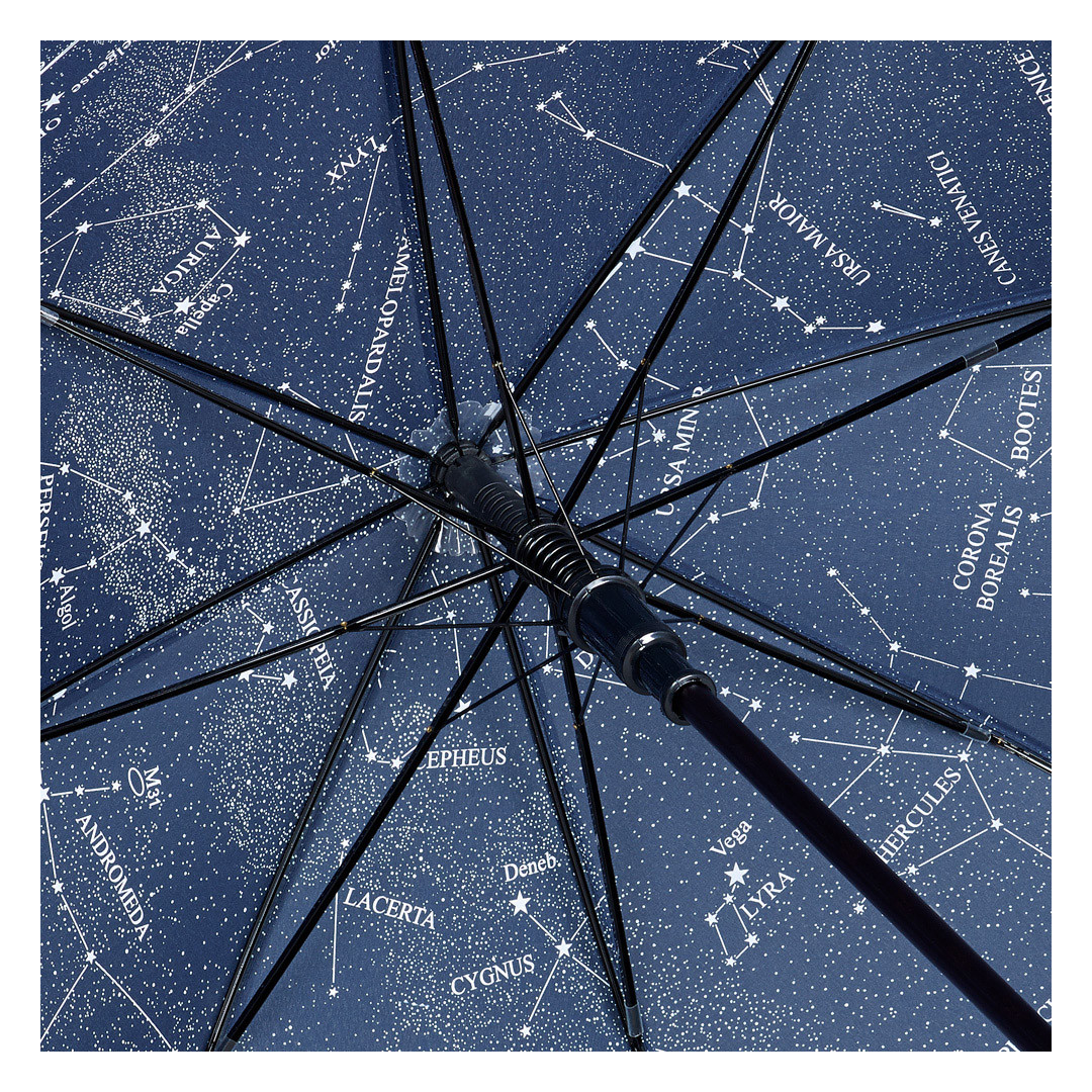 Convenient automatic function for quick opening, wind resistant properties for higher frame flexibility and stability in windy conditions, flexible fibreglass ribs, inside cover with allover constellation design, shaft and shapely crook handle made of genuine wood