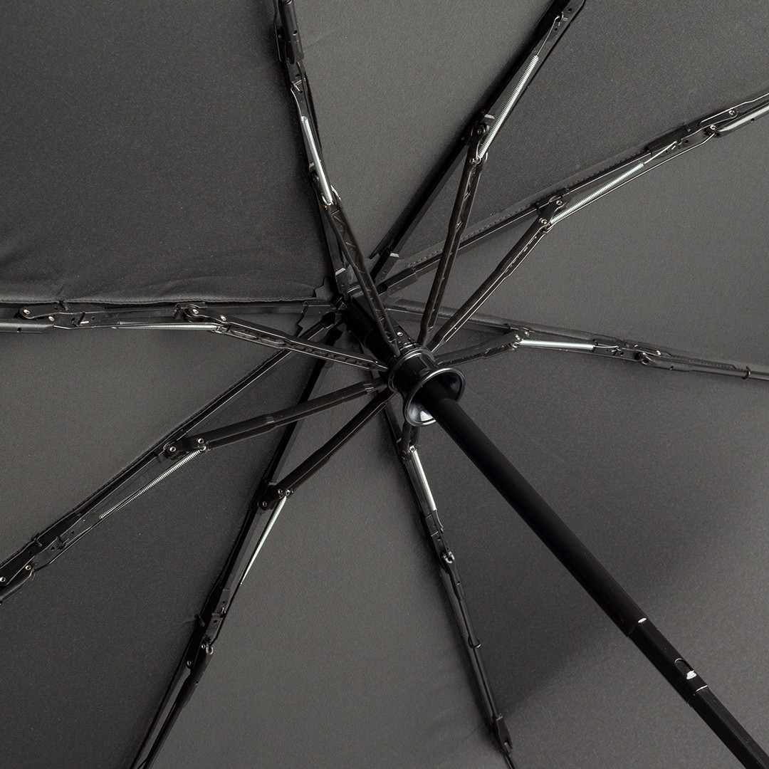 Convenient automatic open/close function for quick opening and closing by pulling down the ring, high-quality Windproof PLUS system for maximum frame flexibility in stormy conditions, polyester pongee material made of recycled plastics, eco-friendly thanks to original waterSAVE® cover material, with waterSAVE® label on the closing strap, silver coloured metal tips, handle high-gloss black with chrome applications and woven carrying loop, closing strap and sleeve with noble push button