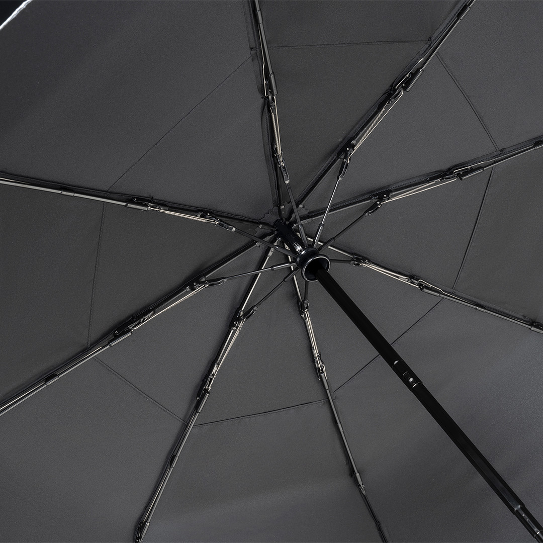 Convenient automatic open/close function for quick opening and closing, high-quality Windproof PLUS system for maximum frame flexibility in strong gusts of wind, flexible fibreglass ribs, Overlapping ventilation cover to regulate excess pressure caused by strong gusts of wind gusts, water-saving coloured polyester pongee waterSAVE® cover material made from recycled plastics and with fashionable reflective piping in silver, with waterSAVE® label on the closing strap, stylish handle made from recycled ABS with integrated push-button