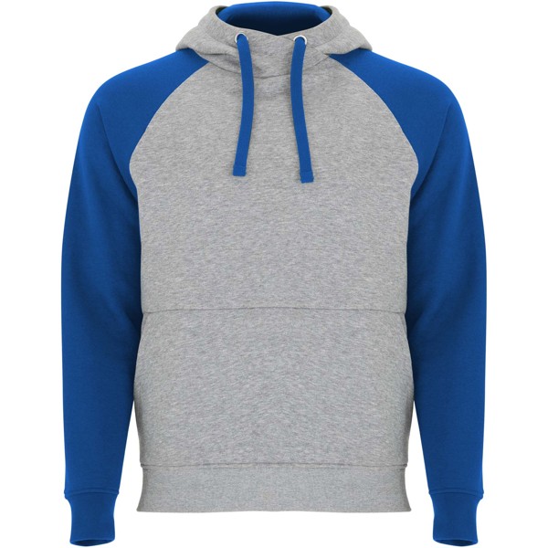 Two-colour unisex hoodie. Hood with crossed neck and metal eyelets. Contrasting inner hood, drawcord and raglan sleeves. Kangaroo pocket. Cuffs and hem in 1x1 elastane rib knit. Removable label.