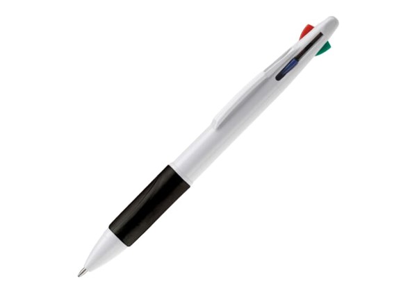4-in-1 pen. White, hardcolour ball pen with coloured grip and four writing colours to choose from: blue, red, black and green.