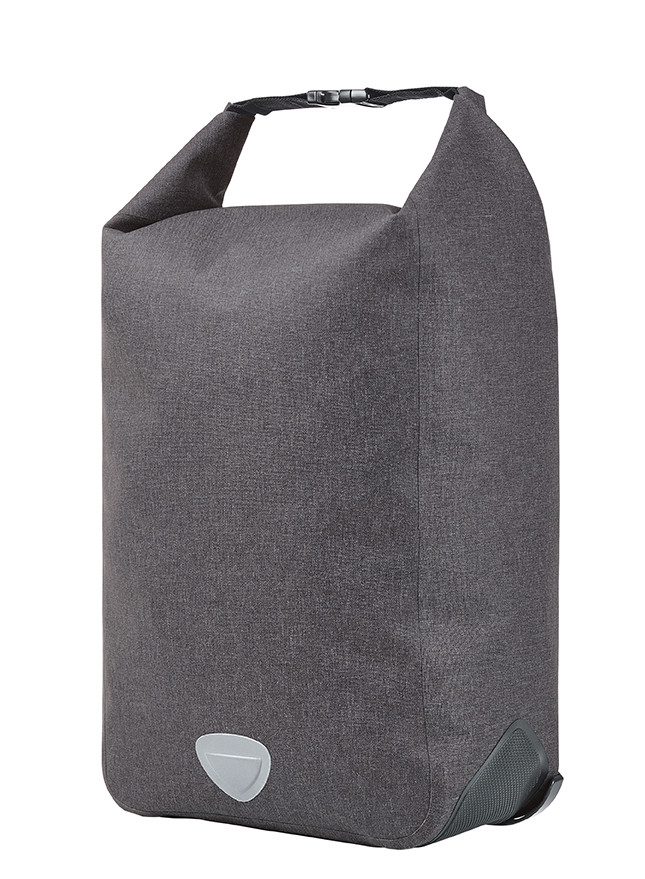 Urban bike bag with spacious main compartment; large, inner pocket with zip; roll-top closure; welded seams for reliable protection against rainwater and moisture; bottom and edge protection; individually-adjustable bracket for luggage rack attachment with twist lock, for security and Velcro closure on the bottom back part of the bag for additional fixation; decorative reflector application; hand grip