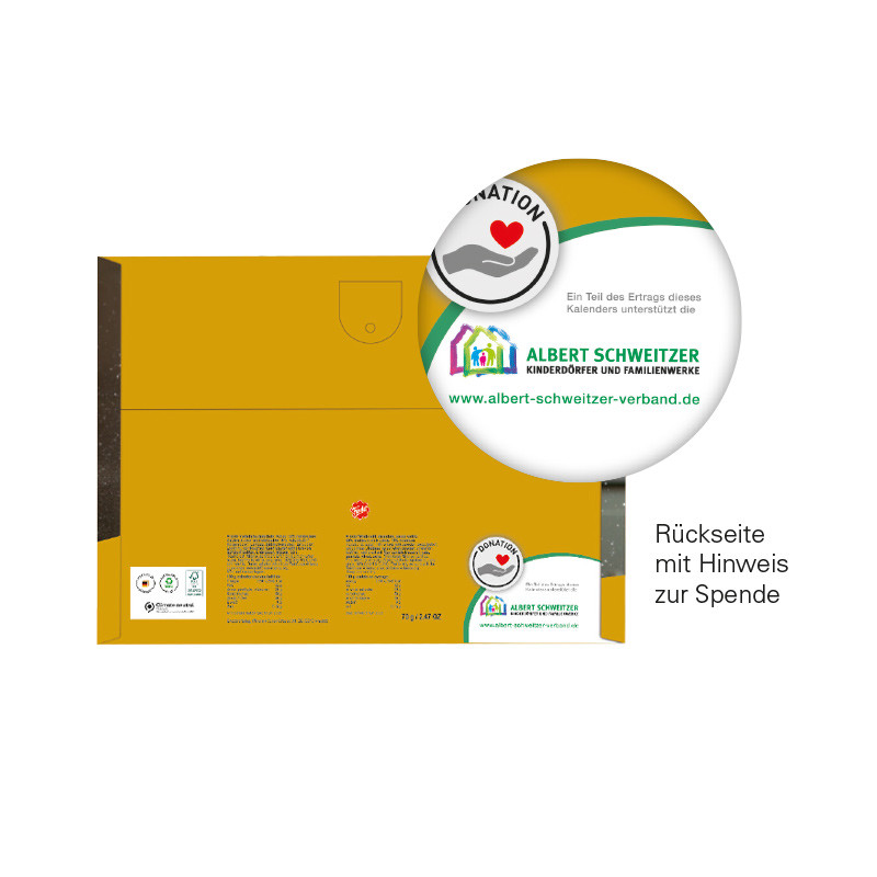 Wall advent calendar, portrait format, solid cardboard cover made of grass paper, individually printed, Inlay recyclable. Part of the proceeds from this calendar supports the "Albert Schweitzer Kinderdoerfer and Familienwerke". Content: 24 Friedel mini chocolate bars, 70 g. Seasonal article - while stocks last! On request and for an additional charge: Packed in individual cardboard box suitable for shipping
