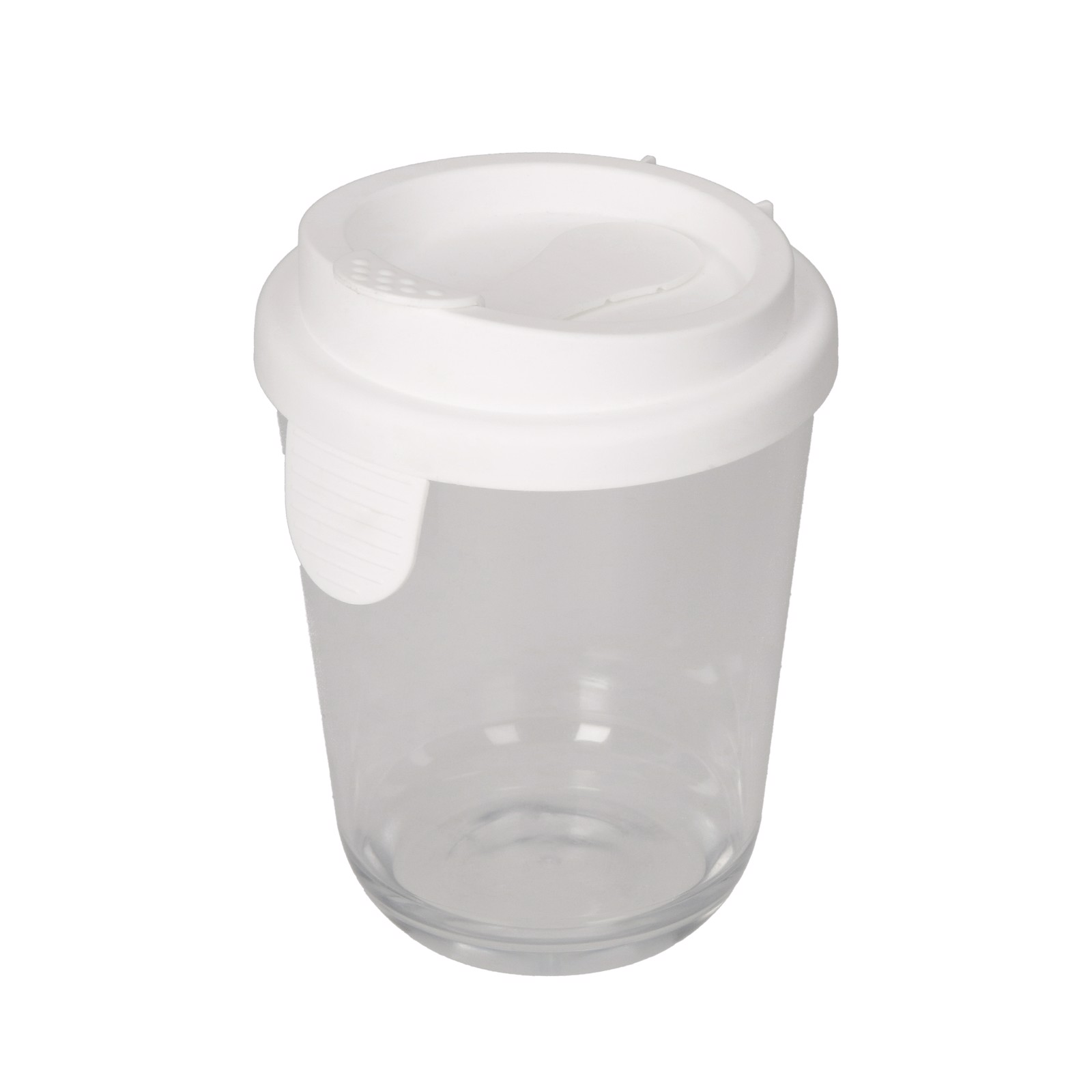 Transparent coffee cup made from shatterproof Tritan in a tapered design with attachable lid. This has two ridged side apertures through which you can safely enjoy even hot drinks. The drink aperture closes with a flexible tab that attaches to the edge of the lid. Capacity: 0.35 litre.