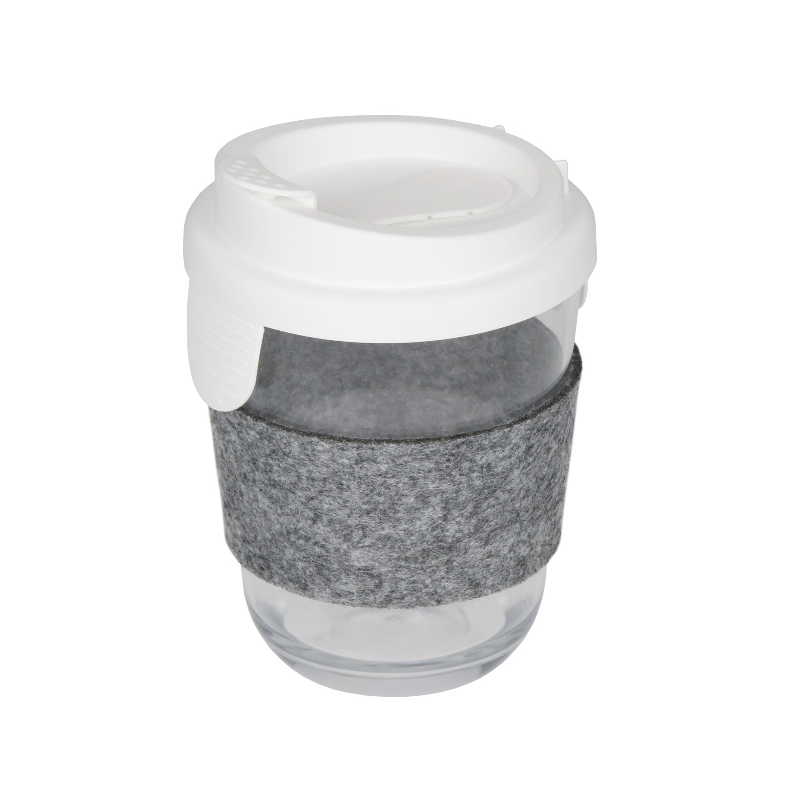 Transparent coffee cup made from shatterproof Tritan in a tapered design with attachable lid and felt sleeve. The lid has two ridged side apertures. Thanks to these and the sleeve, even hot drinks can be enjoyed safely. The drink aperture closes with a flexible tab that attaches to the edge of the lid. Capacity: 0.35 litre.