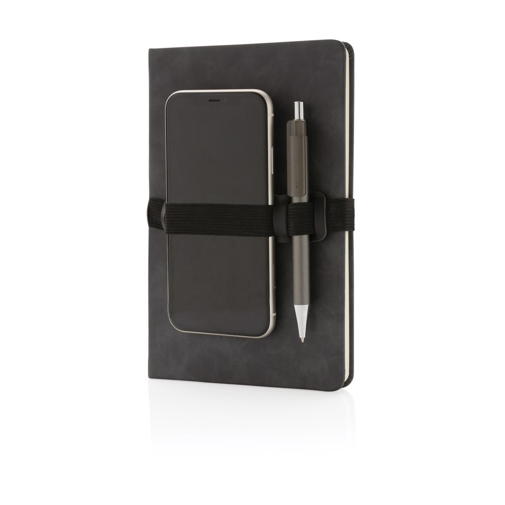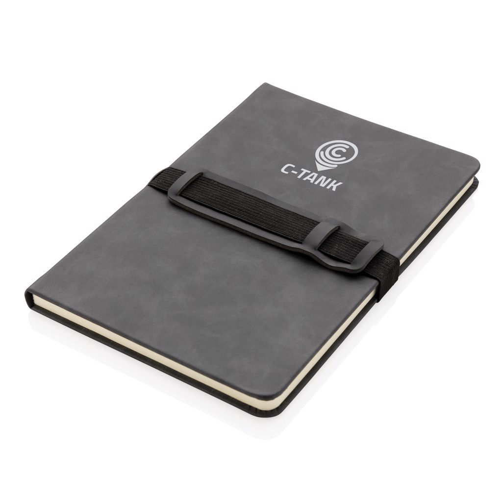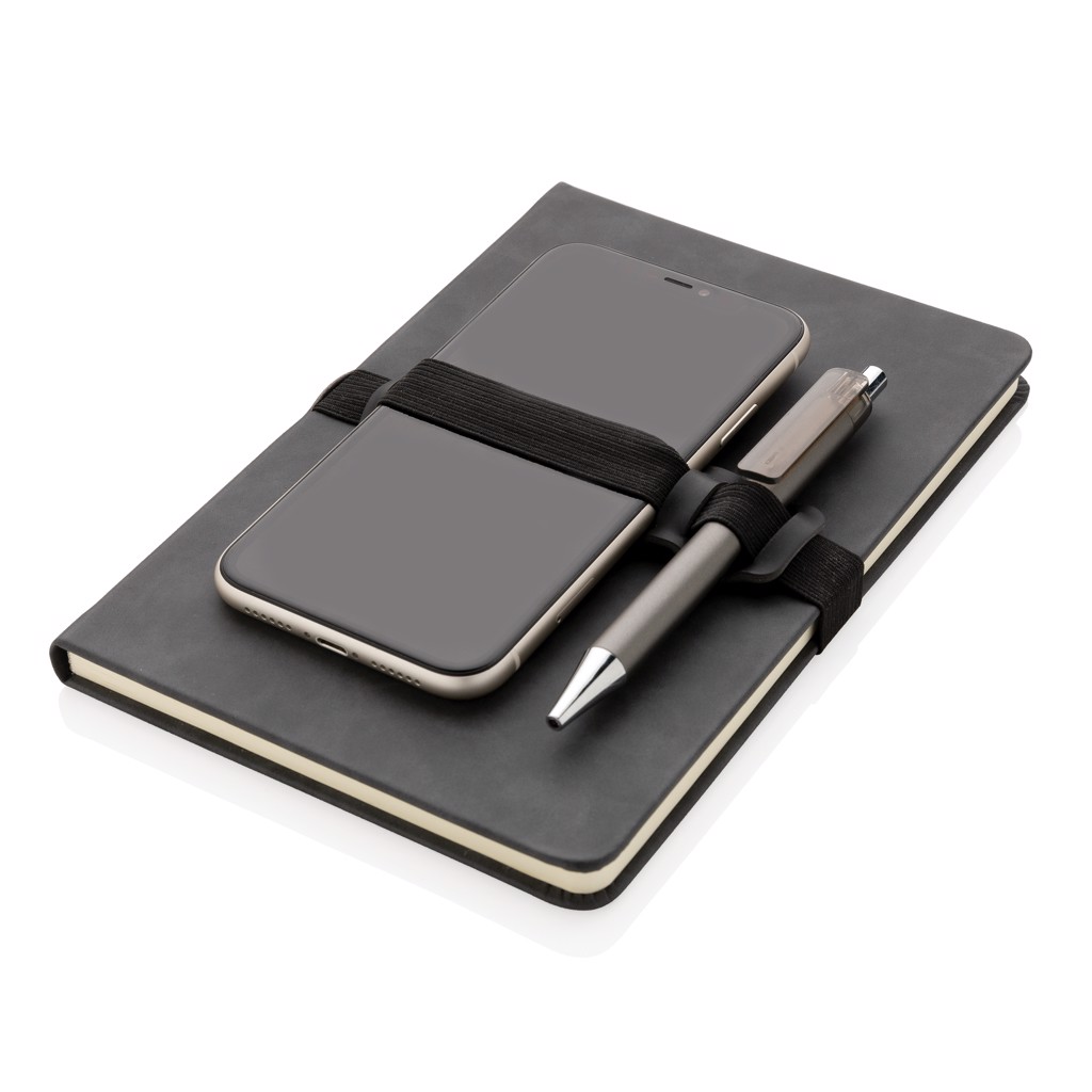 Be ready and prepared for any meeting with this deluxe hardcover PU notebook. Stylish and soft to the touch. The notebook features 80 sheets/160 pages of 70 gm/s cream coloured lined pages. The front of the notebook features a horizontal elastic strap which holds your pen and phone.