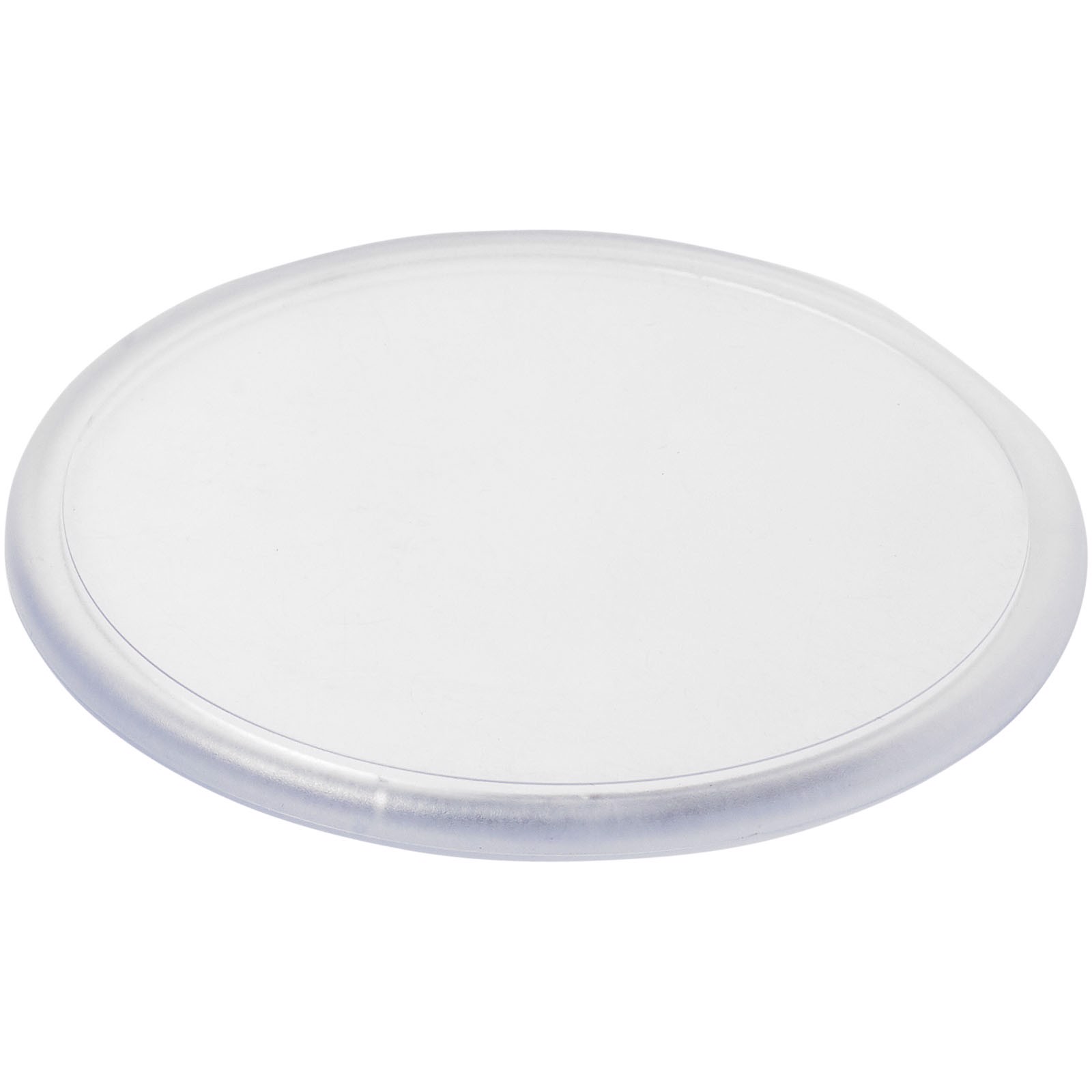 Two-part plastic coaster that carries a printed paper insert. Paper insert can be printed on both sides.
