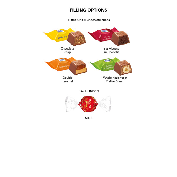 Sweet, unfilled, in a wrapper made of compostable white foil,, individually printed, various flavours.