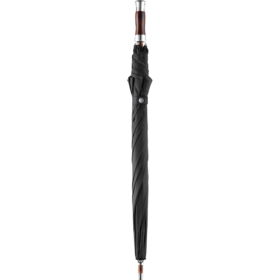 Easy to handle thanks to opening runner, high-quality Windproof PLUS system for maximum frame flexibility in stormy conditions, flexible fibreglass ribs, real wood shaft in flamed optic, chrome-plated details, classic faconné cover, water and dirt-repellent cover properties through original Teflon™ fabric protector, straight handle in mottled maple genuine wood look with chrome-plated details and promotional labelling option, closing strap with chromed notch, high-quality sleeve with large opening and piping