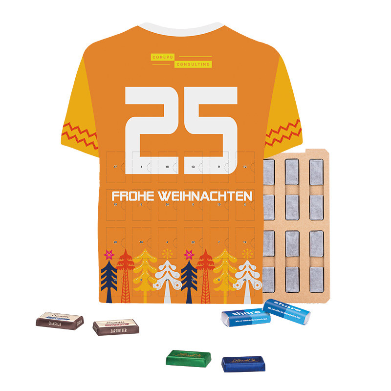 Flat Advent calendar in the shape of a jersey, inlay made of 100 % paper, solid cardboard sleeve individually printed. Content: 24 Alpine milk chocolate bars, wrapped in glassine paper (can be disposed of in the paper bin), 72 g. Seasonal article - while stocks last!