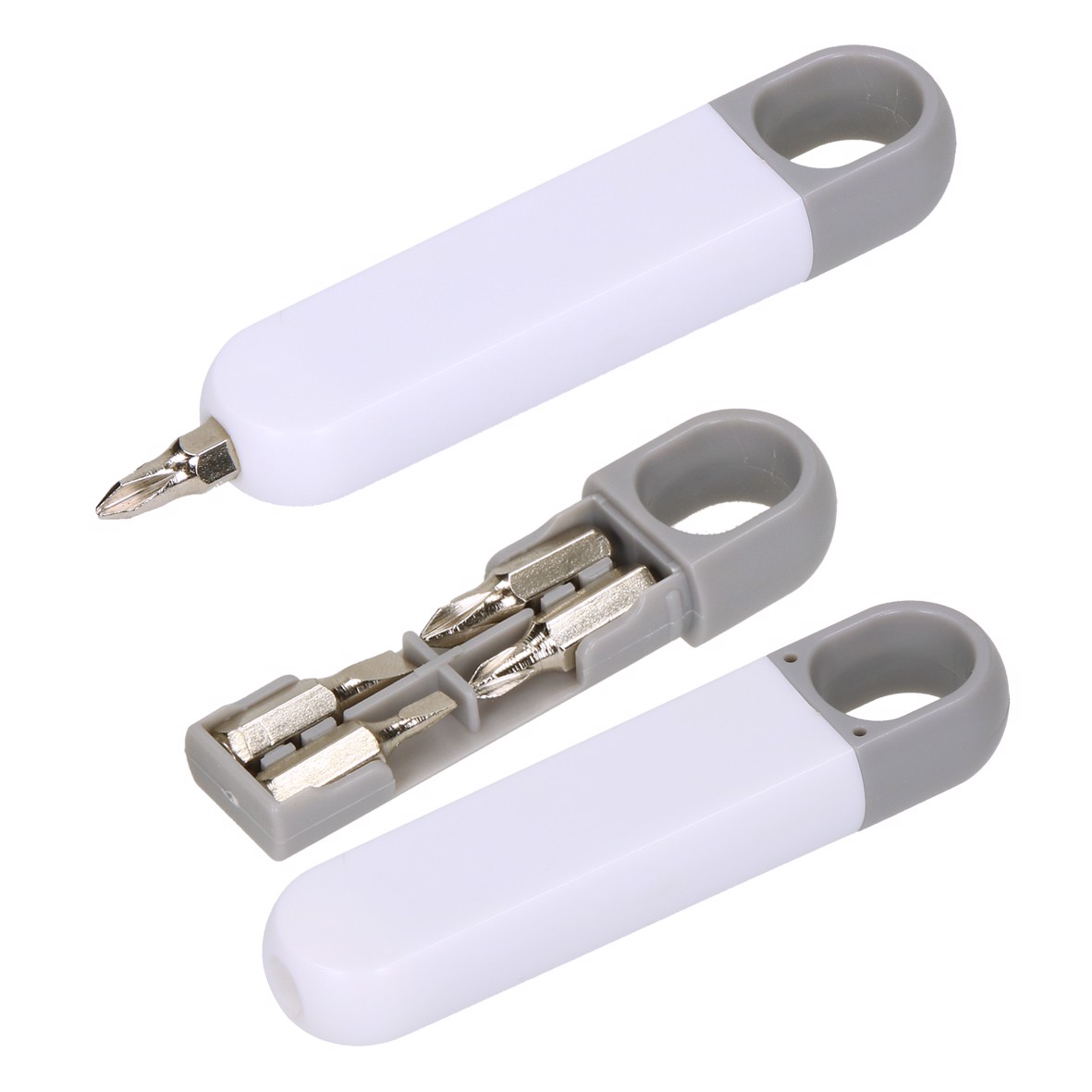 The most common bits always ready-to-hand. Multi tool with two slot screwdrivers and two Phillips screwdrivers inside a plastic slipcase (ABS) with finger hole. Thanks to the magnet the bits (stainless steel) can be easily inserted at the tip of the housing. Can also be fixed to the keyring.