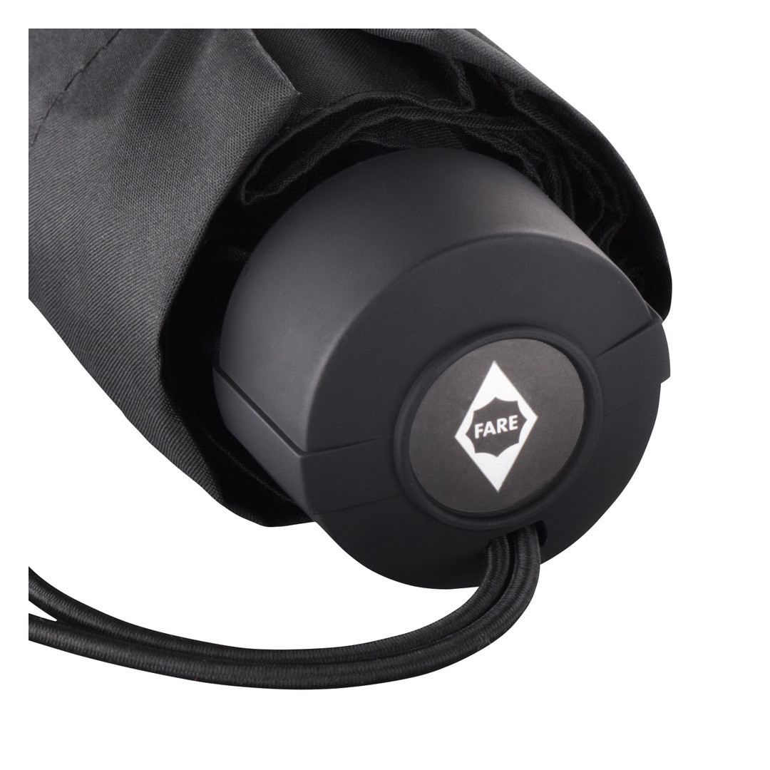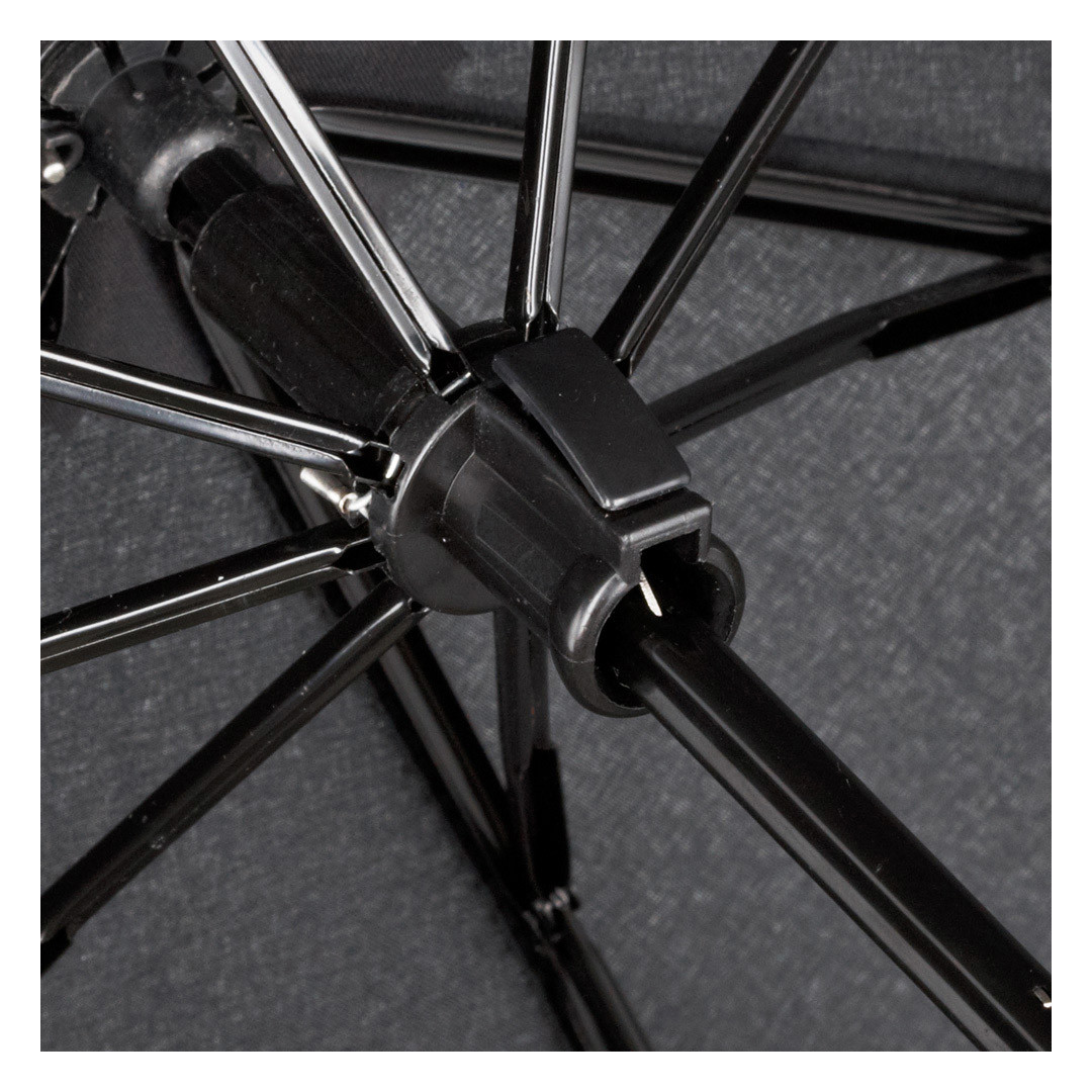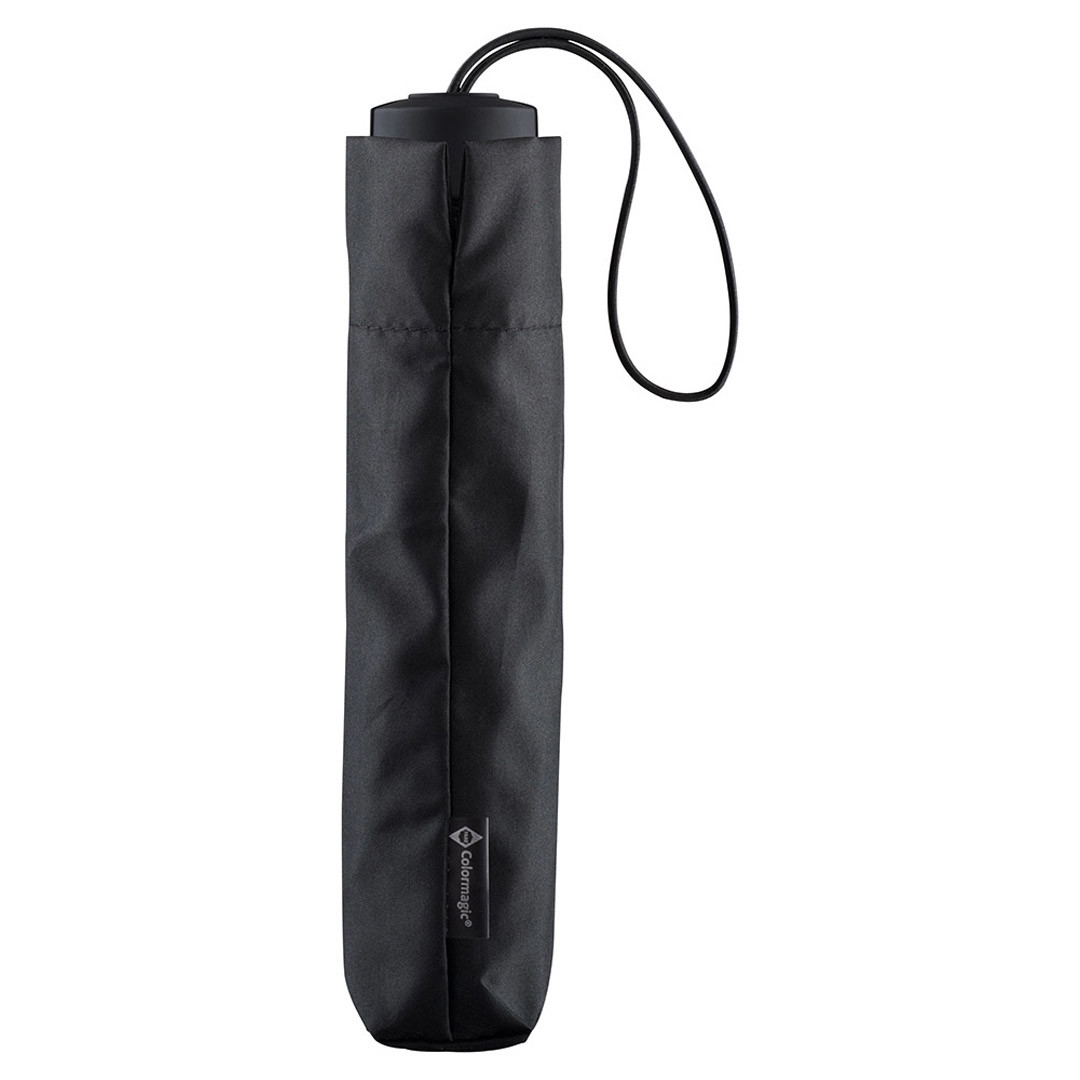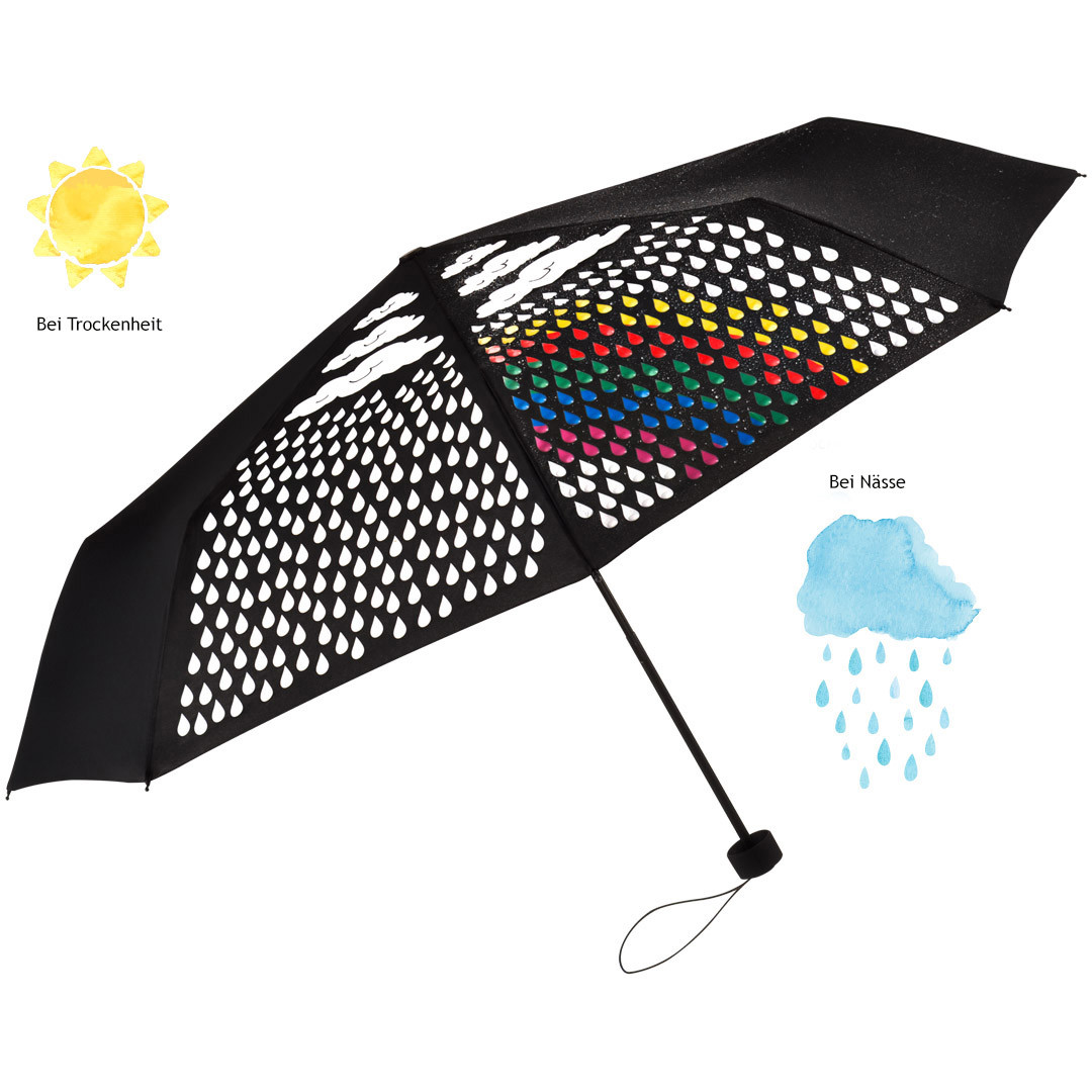Easy to handle thanks to sliding safety runner, Windproof system for higher frame flexibility and stability in windy conditions, cover with special imprint on two panels (white rain cloud motif is visible in dry conditions, coloured rainbow-motif becomes visible in wet conditions), Soft-Touch handle with promotional labelling option. Also available as regular umbrella art. 1142C.