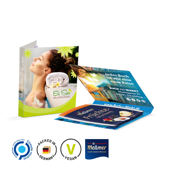 Fold-out promotion card made of white cardboard with a practical tear-off perforation, individually printed. Content: 1 Meßmer Tea Bag, fruit mix 3 g Additional printing costs per order/motif flat rate: 109 €